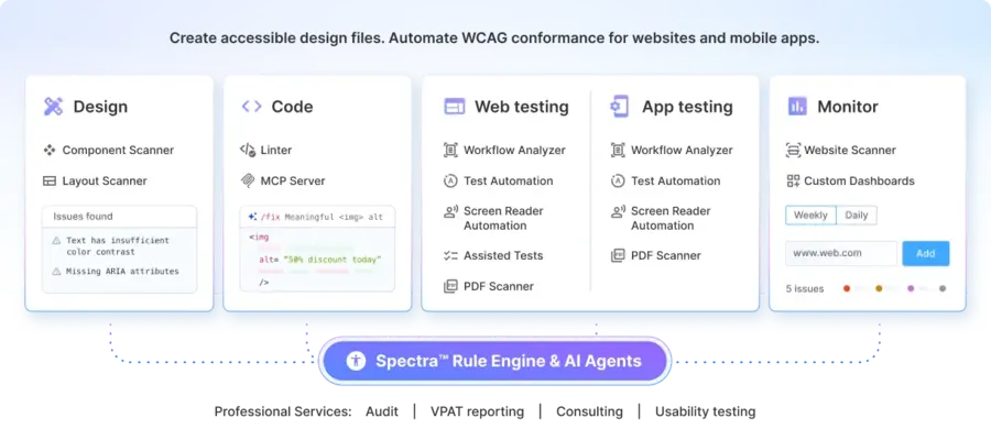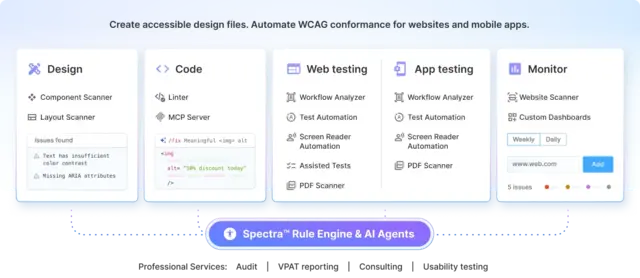 Identify accessibility issues 8X faster with Spectra™ Rule Engine and A11y Issue Detection Agents. Fix issues like a WCAG expert with the A11y Remediation agent.