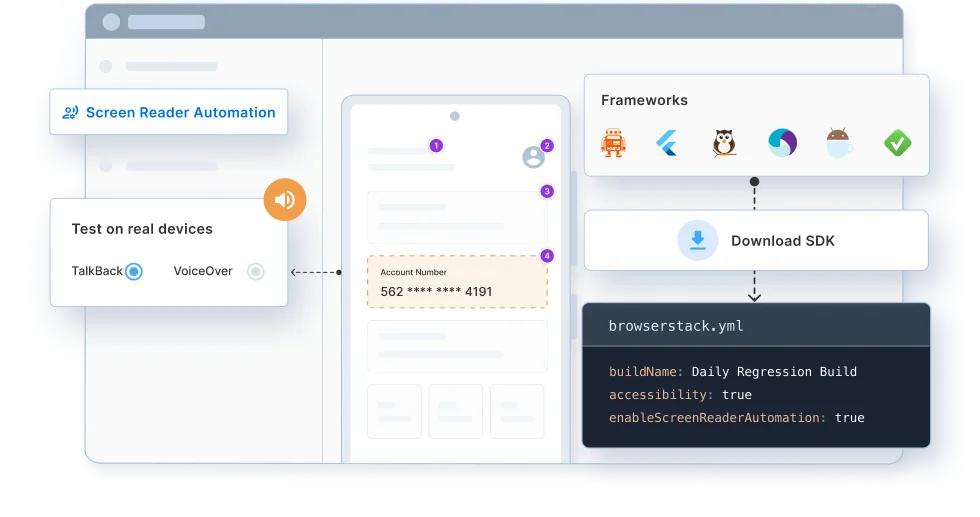 Run TalkBack on Android and VoiceOver on iOS across thousands of real devices, mirroring real-world environment accuracy.