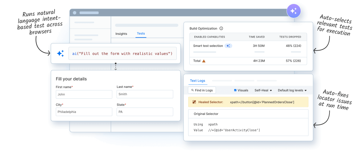 The Self-Healing Agent detects and remediates broken locators in run time for reduced build failures and suggests resilient locators for permanent fixes.