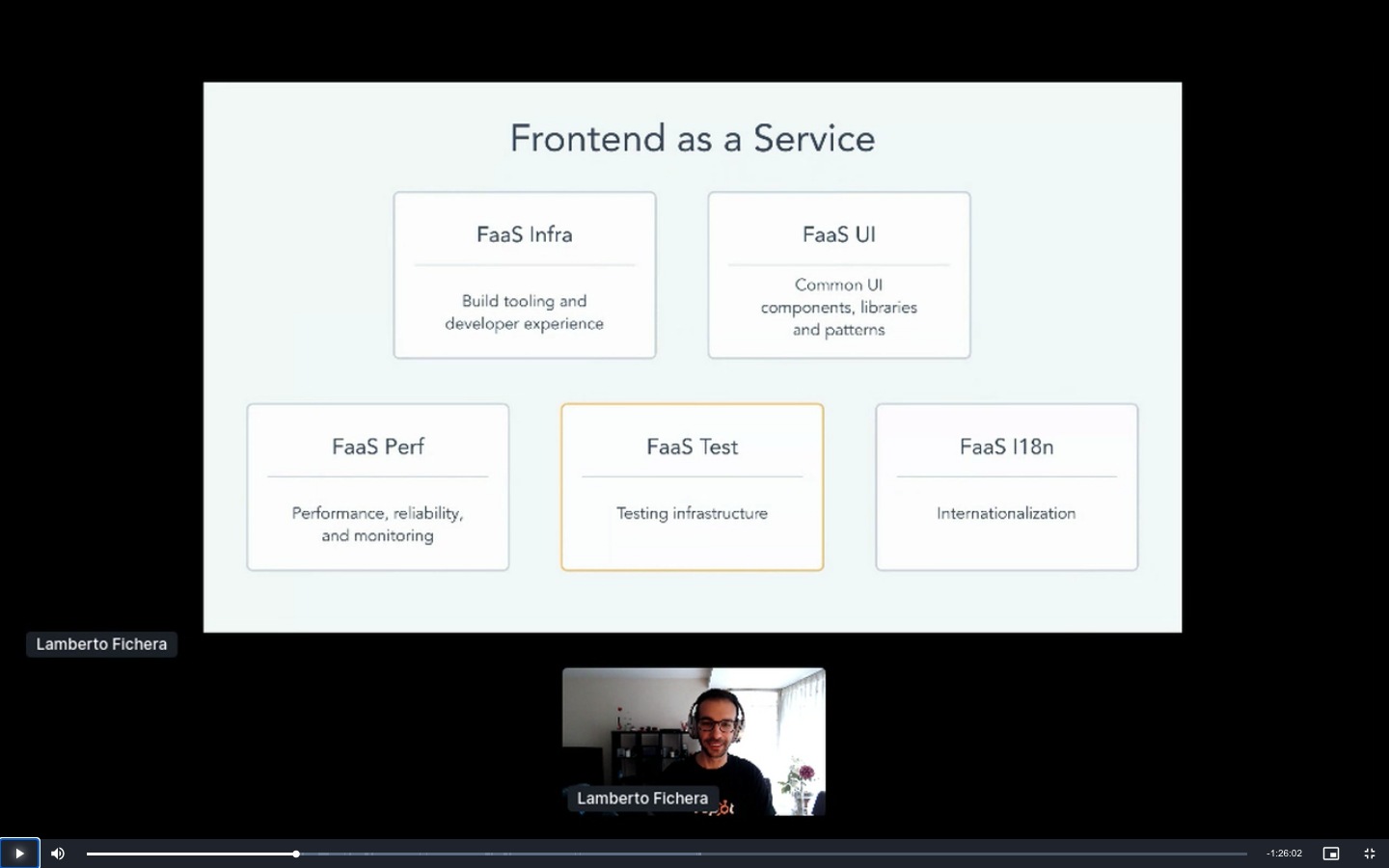 Lamberto talks about FaaS—frontend as a service, a term that’s been coined internally to describe the frontend infrastructure testing team at HubSpot. The goal of this team is to empower engineers to ship consistent, reliable and performant user experiences.