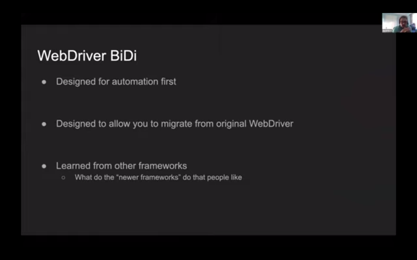 David Burns, core contributor to Selenium reveals the future of Webdriver: Webdriver BiDi, focused on bidirectional communication and designed for automation-first setups, with maintenance and migration given a priority.