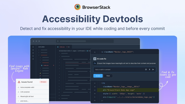 [NEW LAUNCH] Fixing accessibility bugs post-release costs 25x more than catching them during development. BrowserStack's Accessibility DevTools scans your code in real-time across 15 IDEs including VS Code, JetBrains, Xcode, and Cursor. It integrates with your AI coding assistant and blocks violations in CI/CD before they ship.