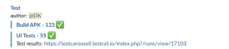 - After the jobs finish executing, we notify developers about the results on Slack. We created a custom script that sends a message like the one below: