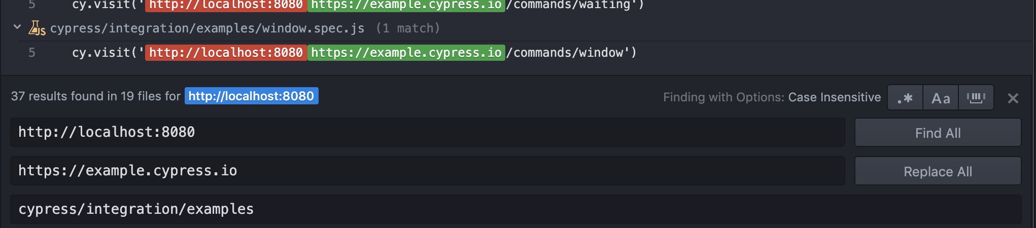 Alternatively, you can replace all occurrences of localhost:8080 with https://example.cypress.io as follows: