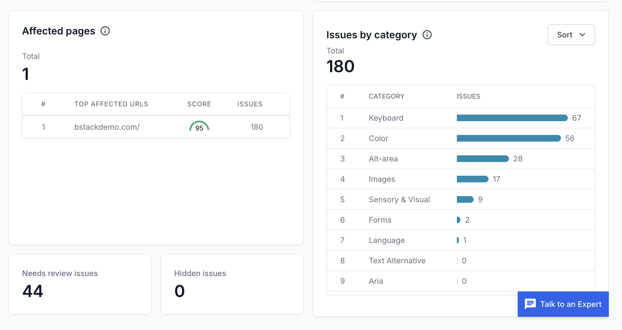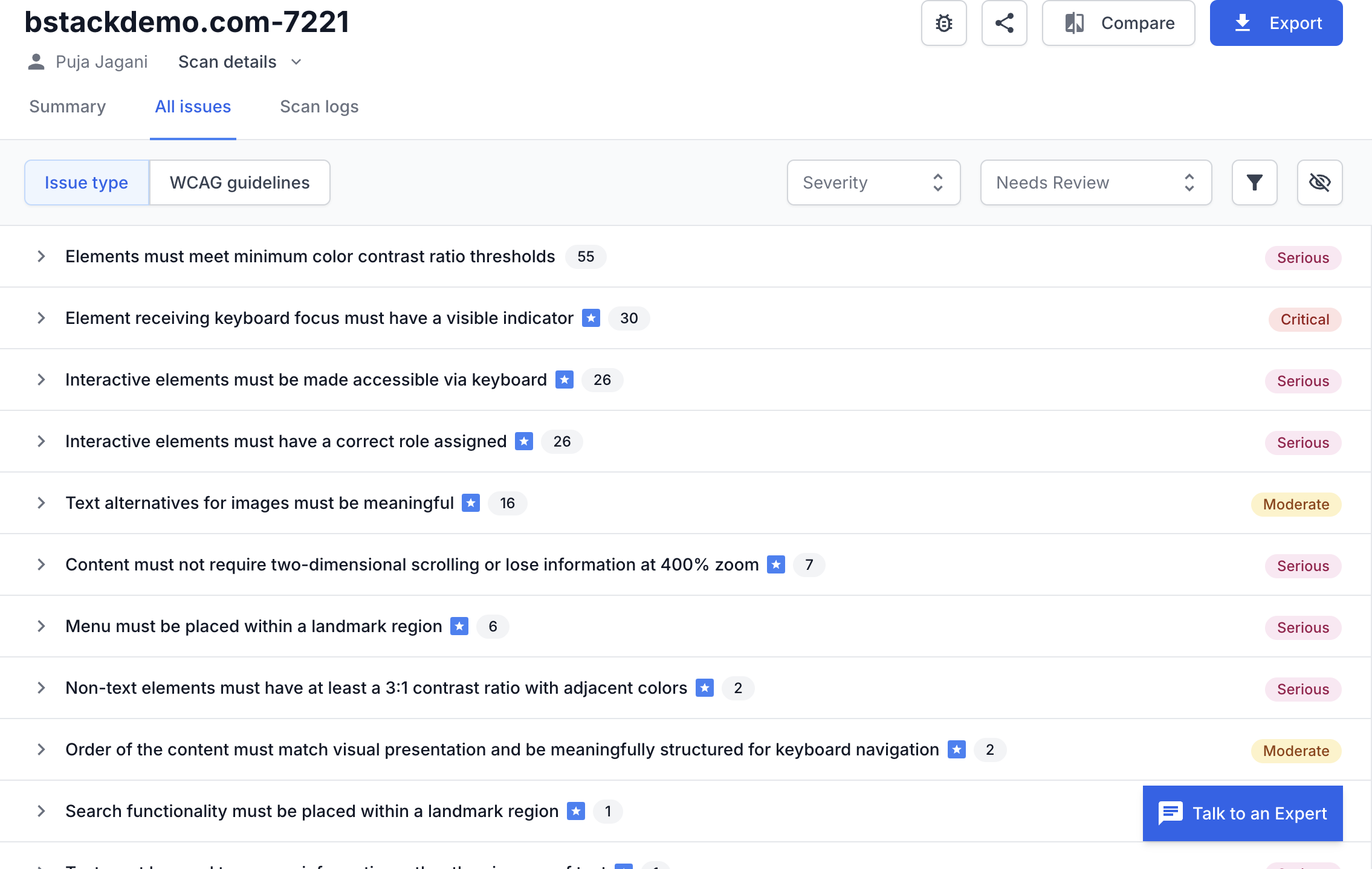 Click on “Create Scan”, and there you go! Wait for the scan summary report. The report gives you detailed information about all accessibility issues by category.