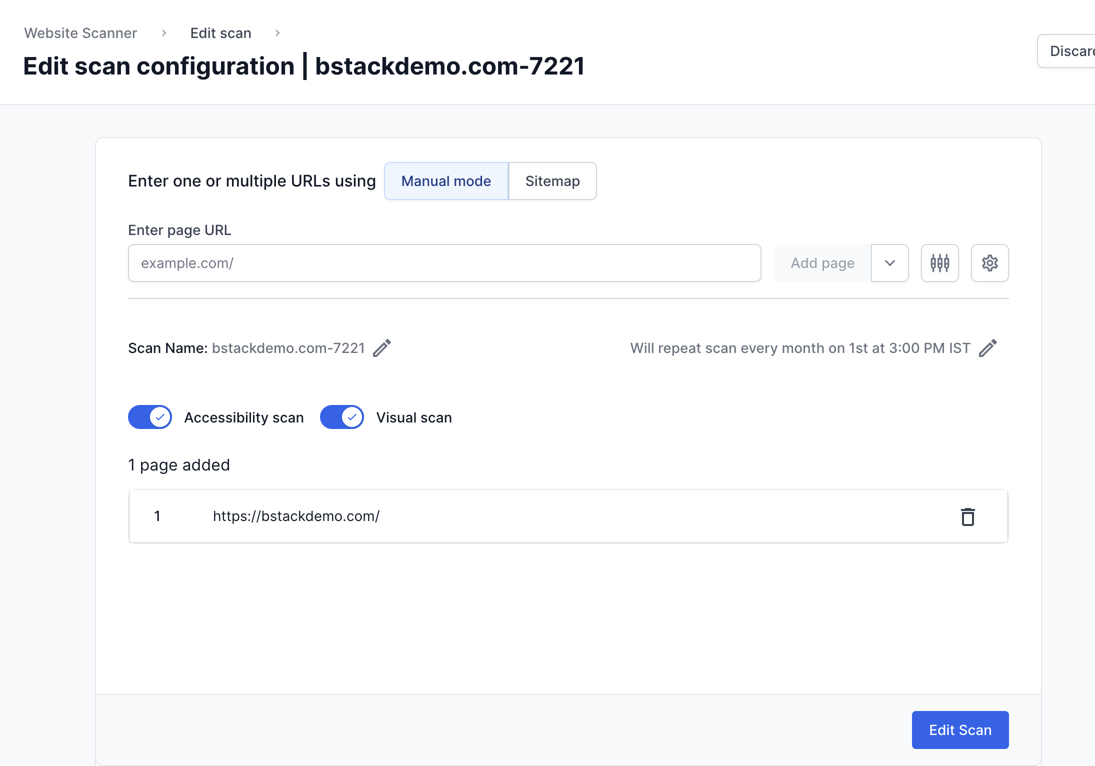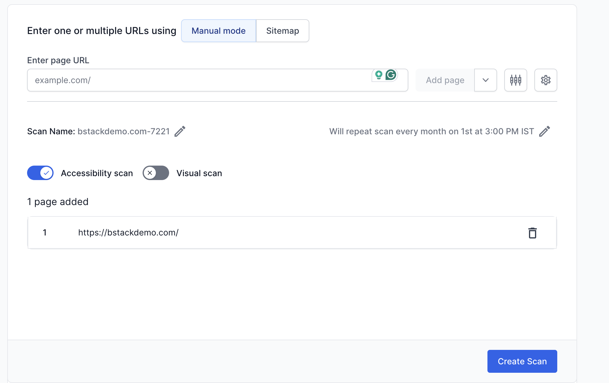 - Toggle the “Accessibility scan” button on and click on “Add Page”.
