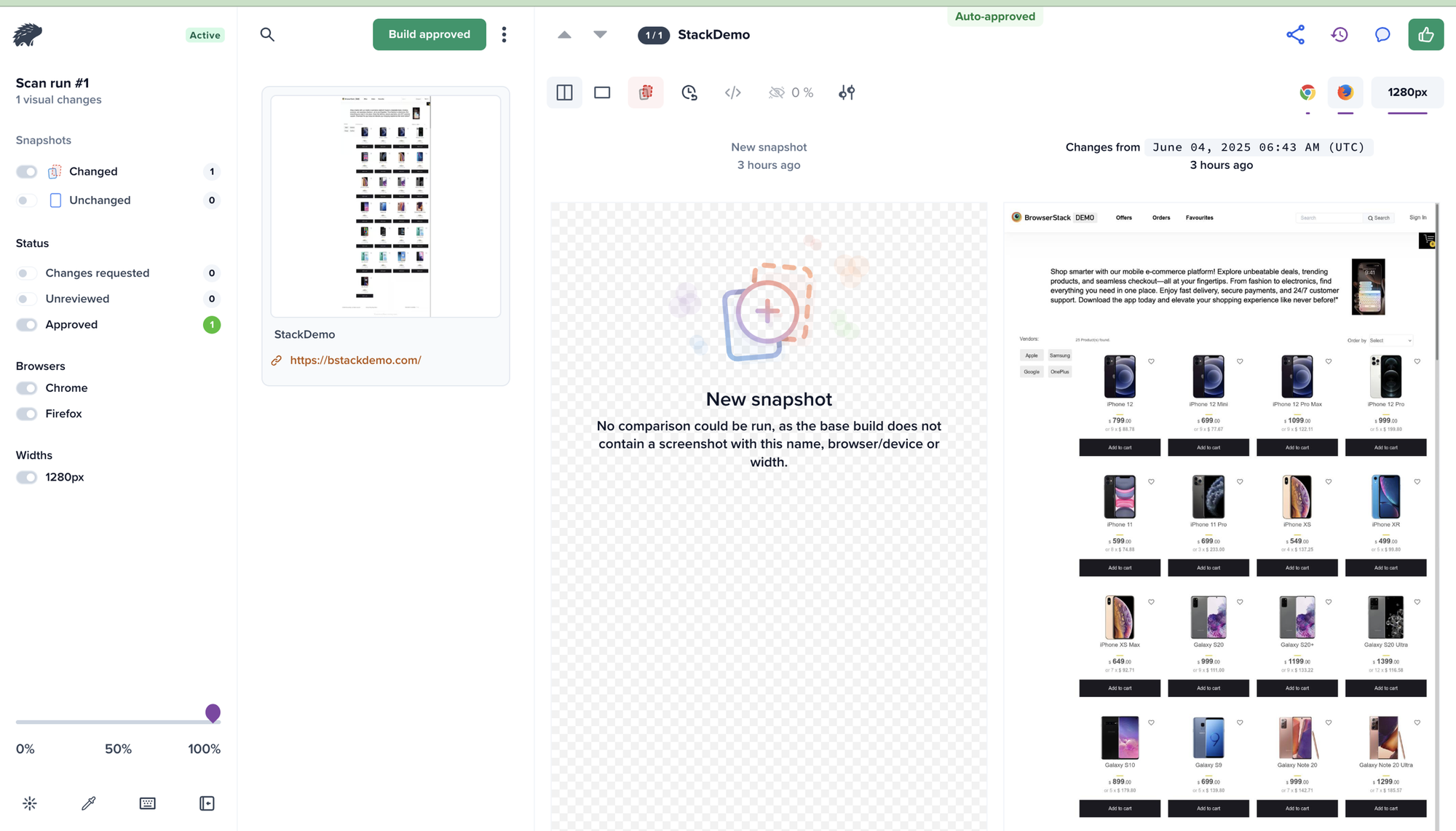 The visual scan report will be ready, and you can review it using BrowserStack's Percy. You can tweak various settings to ensure a strict or lenient scan and even pick available desktop widths. You can also configure the diff sensitivity for your project to customise how visual changes appear in builds.