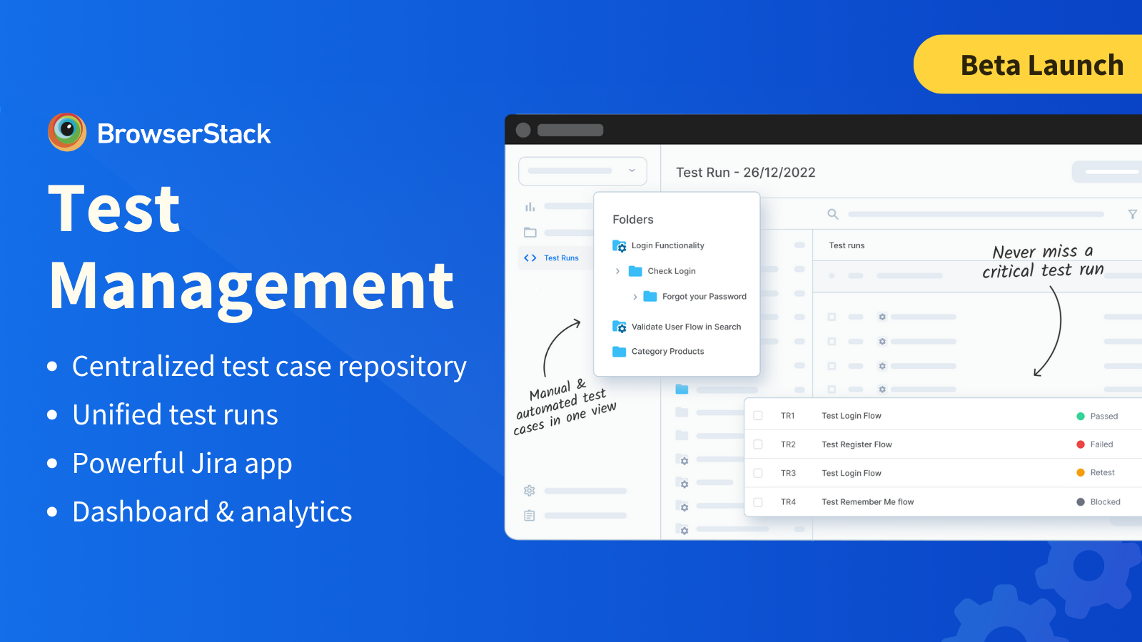 We are thrilled to announce the beta launch of BrowserStack Test Management, a comprehensive platform designed to modernize test management and enhance testing efficiency. With its powerful set of features, Test Management empowers testing teams to streamline their workflows, enhance collaboration, and achieve faster releases.
