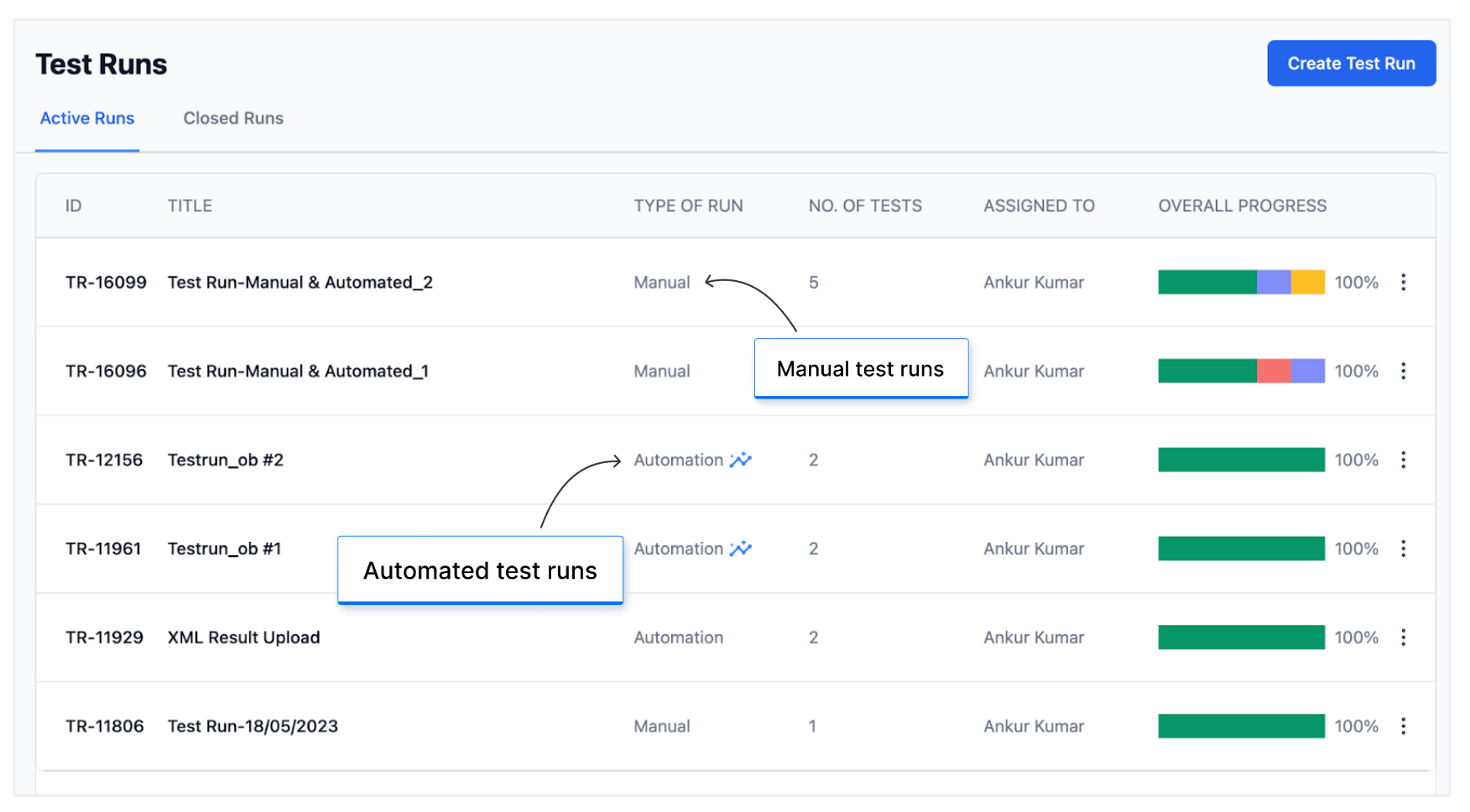Test run management: Plan, schedule, and execute test runs effortlessly. Testers can create test suites, assign test cases, and track progress in real-time. Our tool is compatible with popular testing automation frameworks, and it allows you to upload standard JUnit-XML/BDD-JSON reports generated by these frameworks.