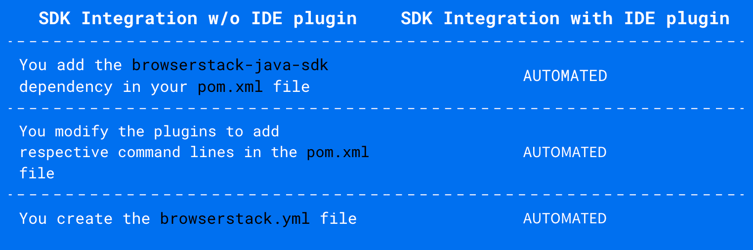 BrowserStack is thrilled to announce IntelliJ and Eclipse IDE plugins to further speed up build integration with BrowserStack SDK. Use these IDE plugins for seamless integration of BrowserStack SDK with your Java-based test suites.
