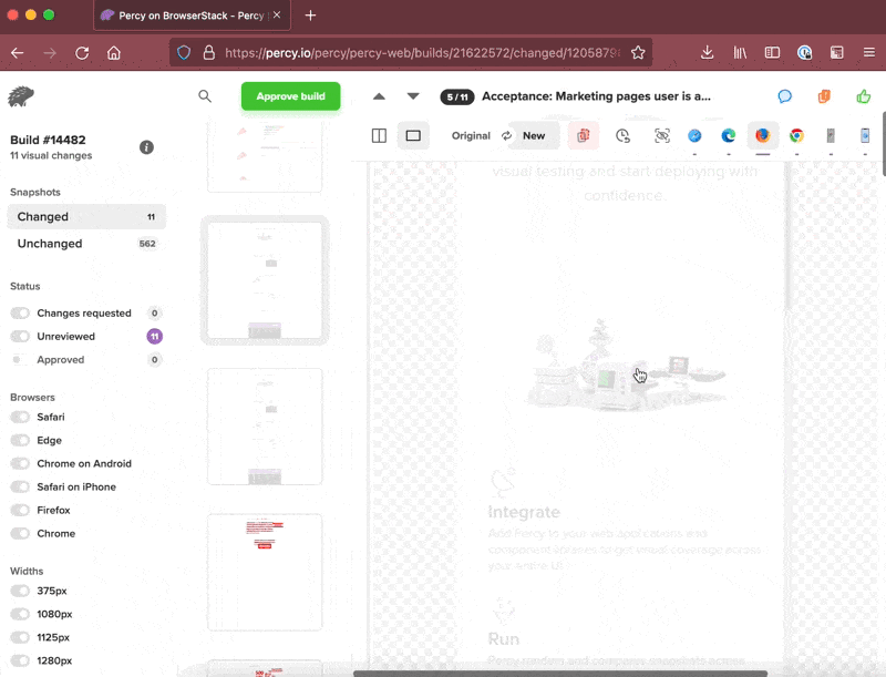 Percy now highlights the exact pixels that cause the page shift instead of marking all of the page's contents as a diff. Our goal with Percy Visual Engine was to significantly reduce noise and highlight only the most important changes and you can see the change in the image below.