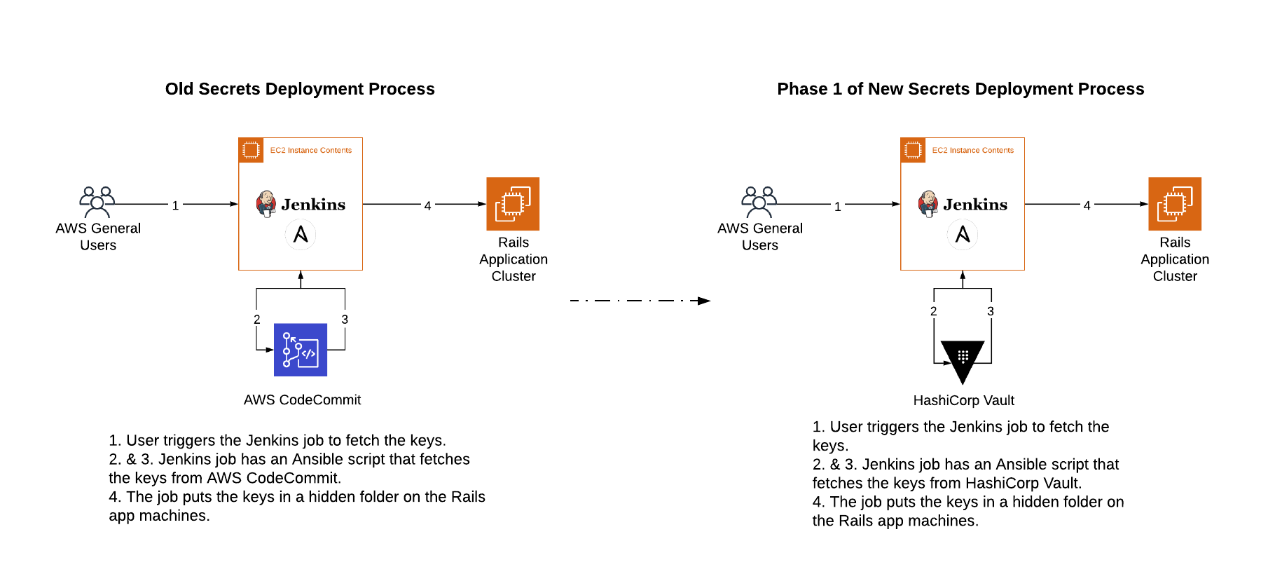 Whenever we needed to update them, we would start a Jenkins job. It would fetch the keys from CodeCommit and put them in a hidden folder on the production machines. Then we would start a deployment script to deploy the application. It would pick up the keys from the hidden folder and create a new release.
