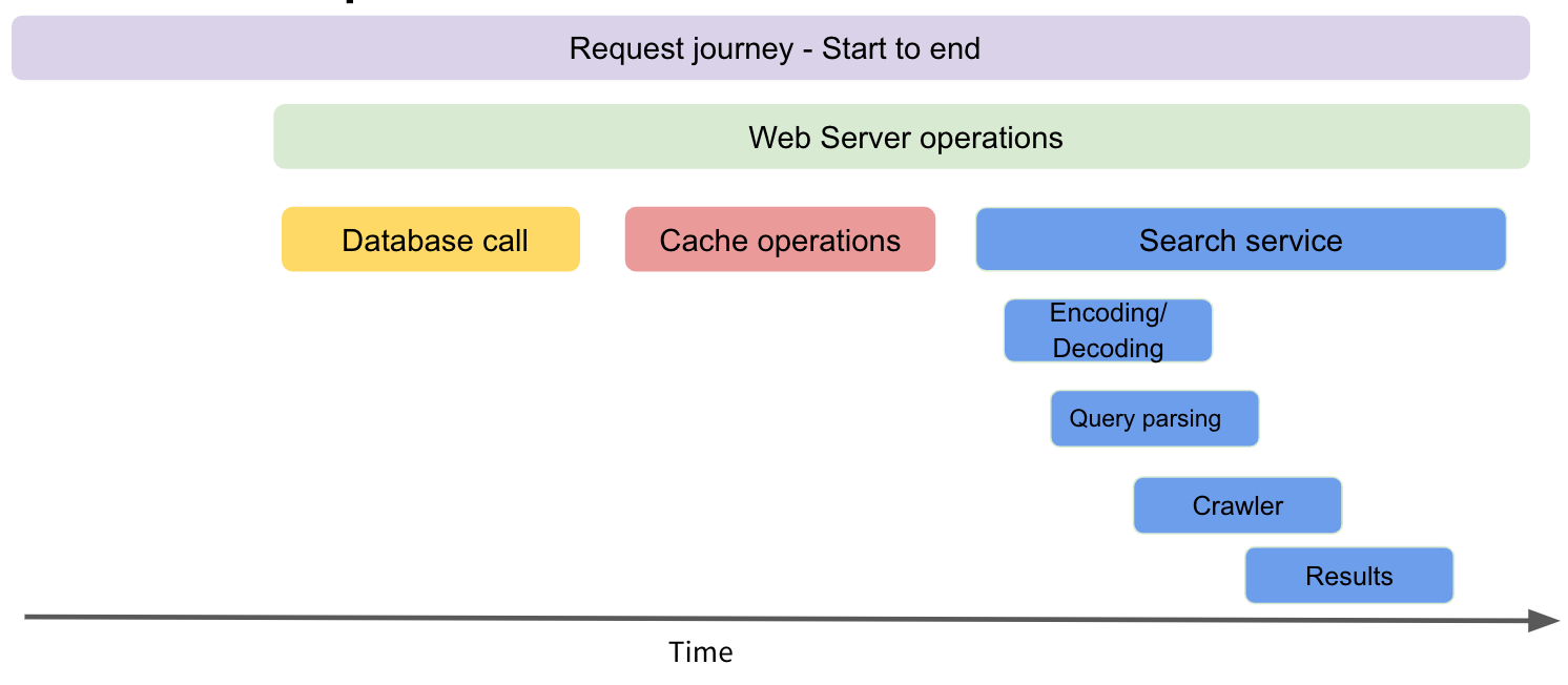 Within each operation, there might nested operations (child spans). The search service will have child spans for encoding/decoding step and query parsing.