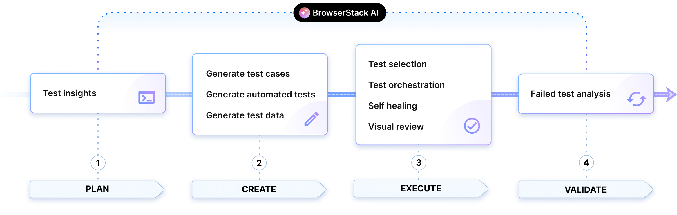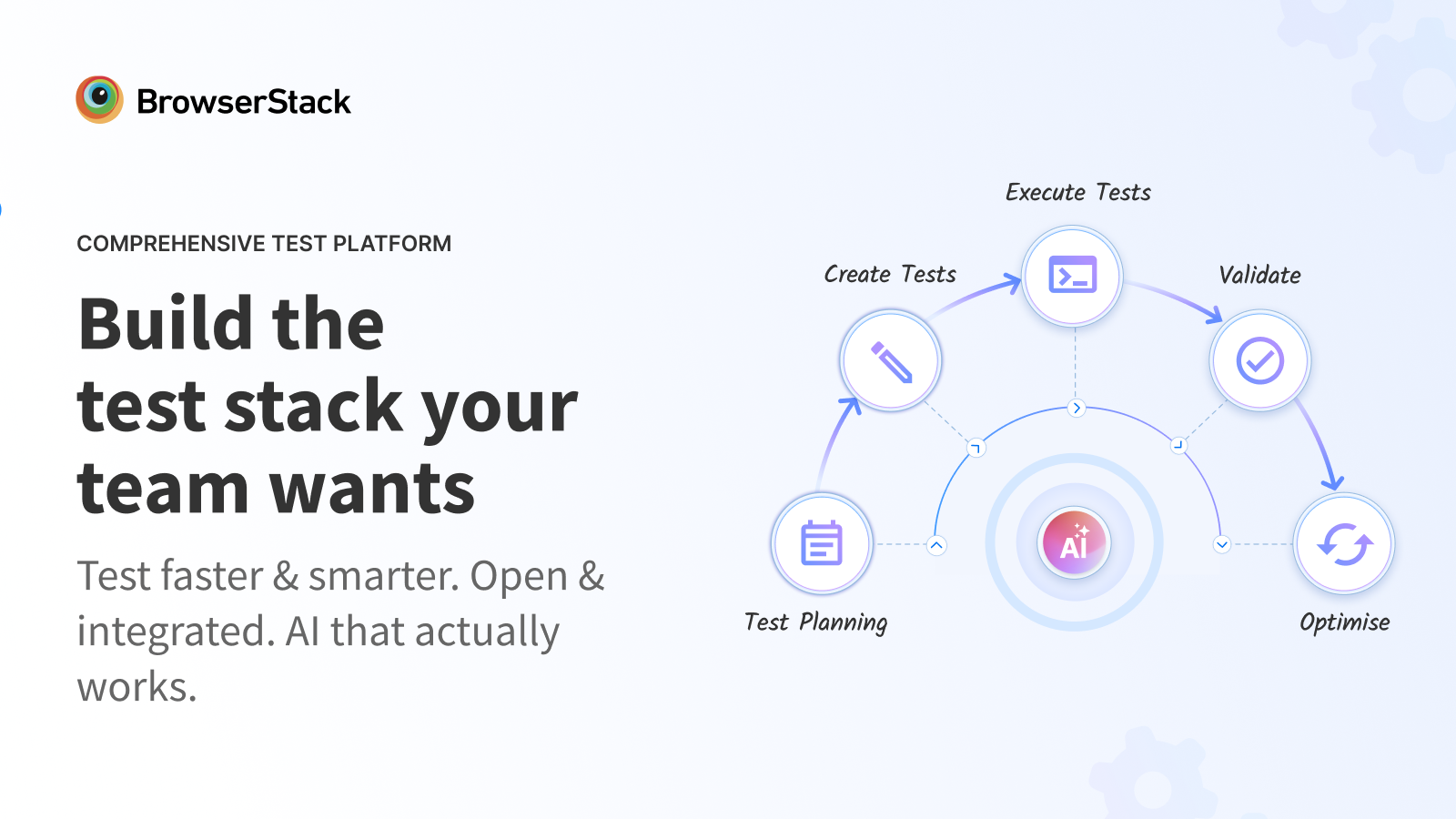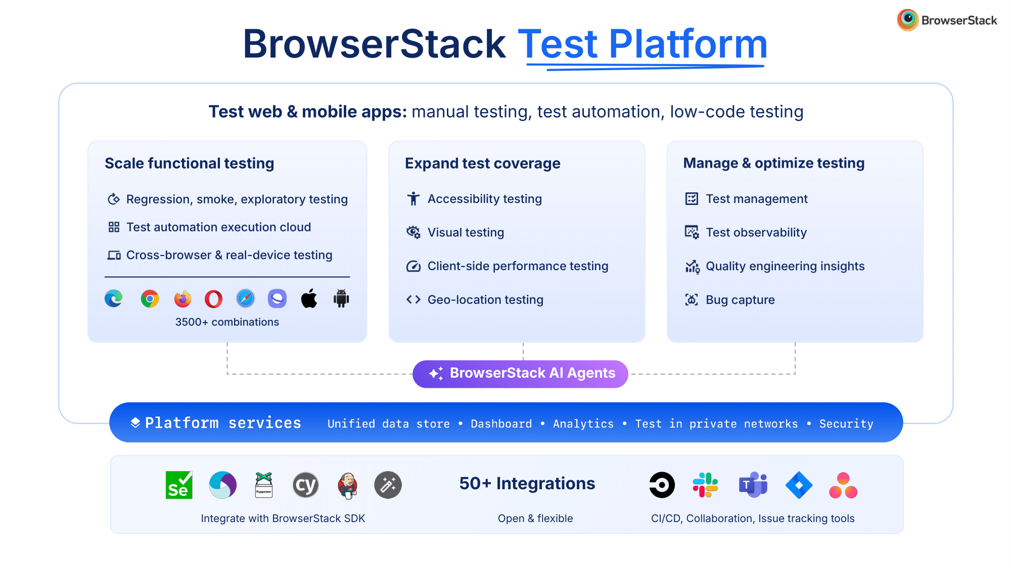 Today, we're thrilled to introduce the BrowserStack Test Platform—an open, integrated and flexible platform featuring AI-powered testing workflows that enable users to simplify their toolchain into a single platform, eliminating fragmentation, reducing costs, and improving productivity. Built to enhance efficiency, the Test Platform transforms how teams approach quality, delivering up to 50% productivity gains while expanding test coverage.