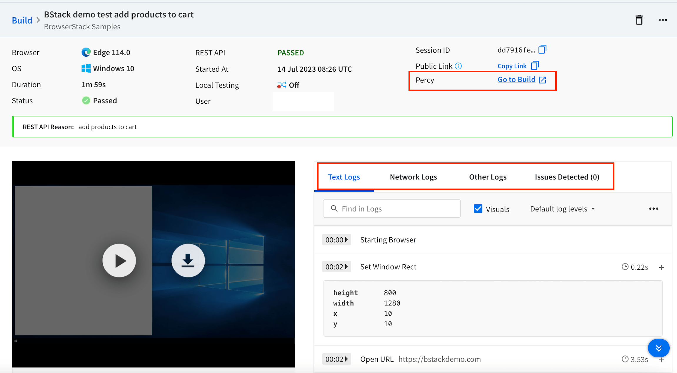 - When Automate builds are generated, you can utilize a range of logging options, such as Text Logs, Network Logs, Other Logs, Issues Detected, and more, to comprehensively review your builds.