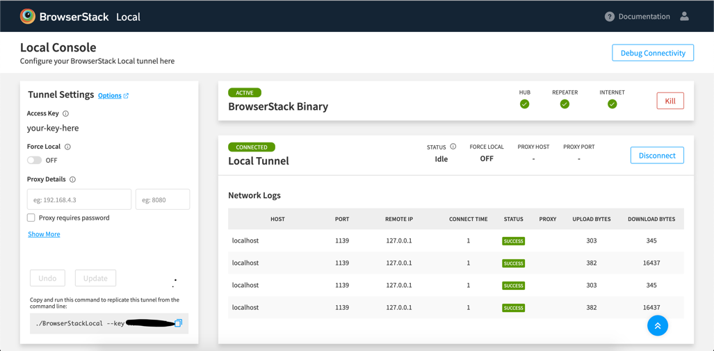 Once the tunnel has been established, you can start testing on Live, or check out the documentation to start testing with Automate.
