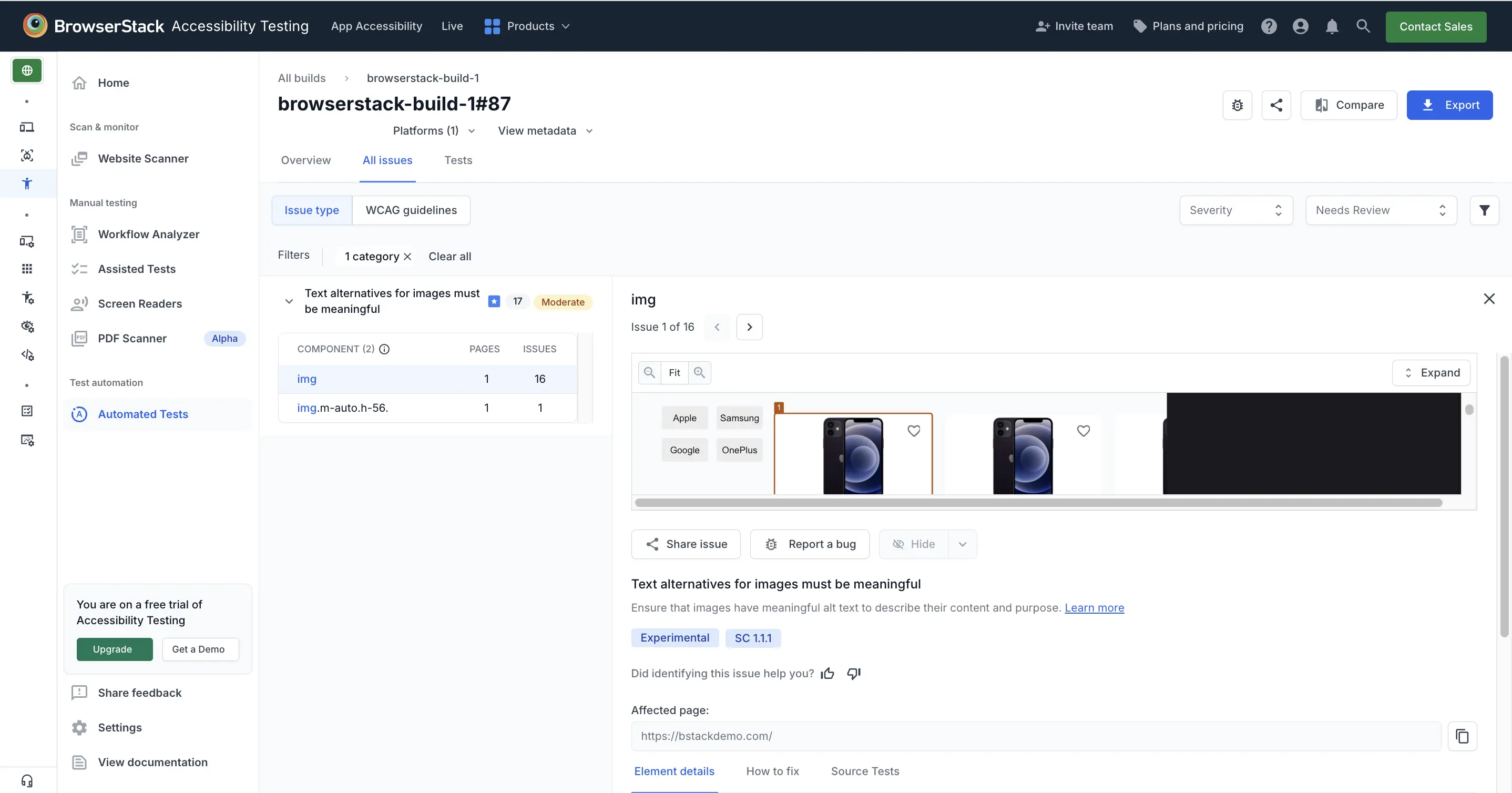 The All issues tab lists the de-duplicated version of accessibility issues across all test cases in your build by Issue type and WCAG guidelines.