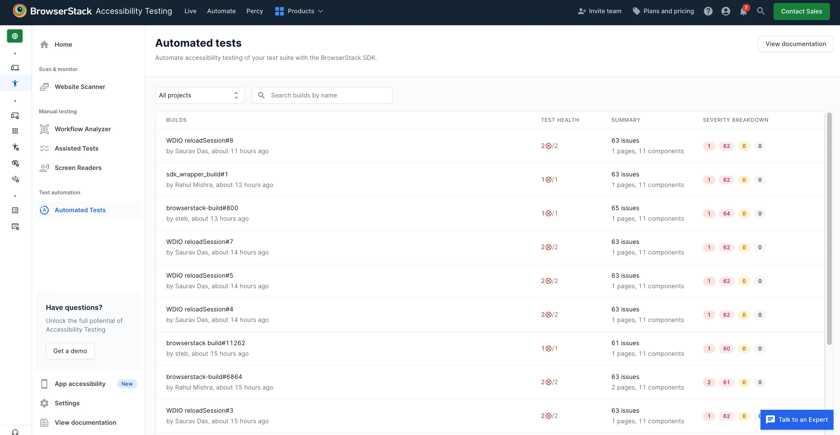 The Automated tests page showcases all the reports generated by the automated tests in BrowserStack Accessibility Testing. This page groups the results of your automated accessibility reports into projects.