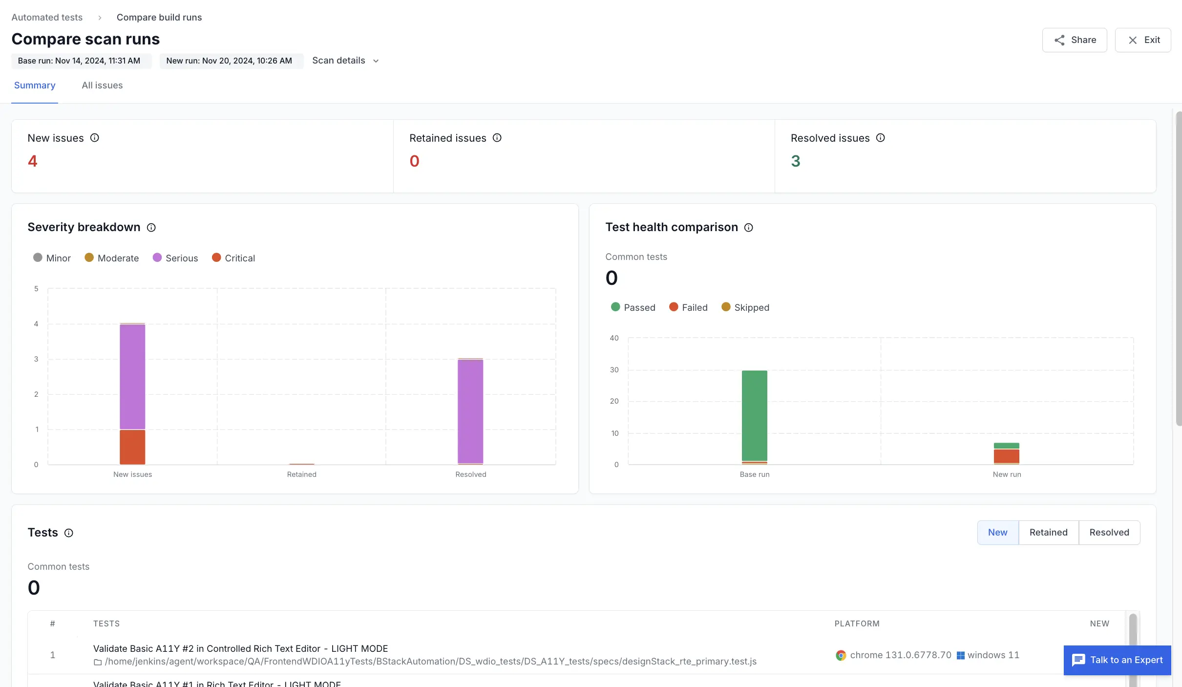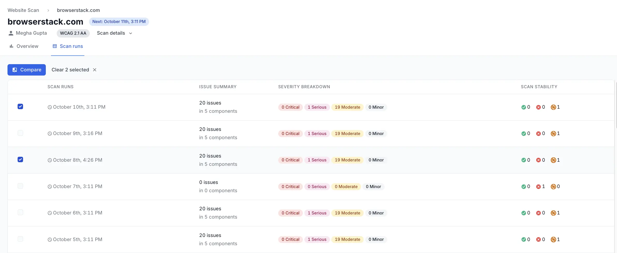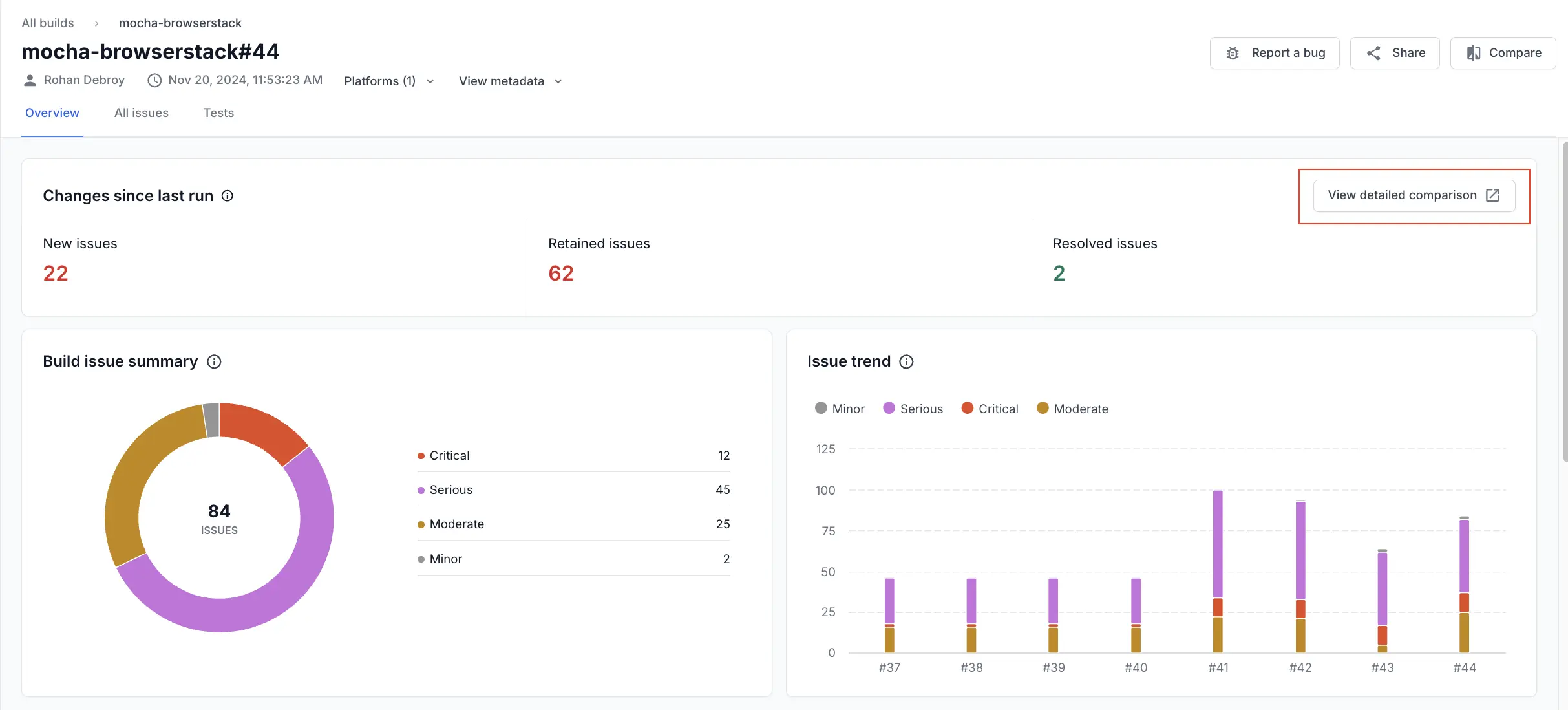 The reports comparison feature allows you to compare two scan runs or two Automated Tests reports of a website. You can compare multiple scan runs belonging to the same build (not two reports from multiple builds) using reports comparison. Using this feature, you can effectively track the progress of accessibility compliance on your website.