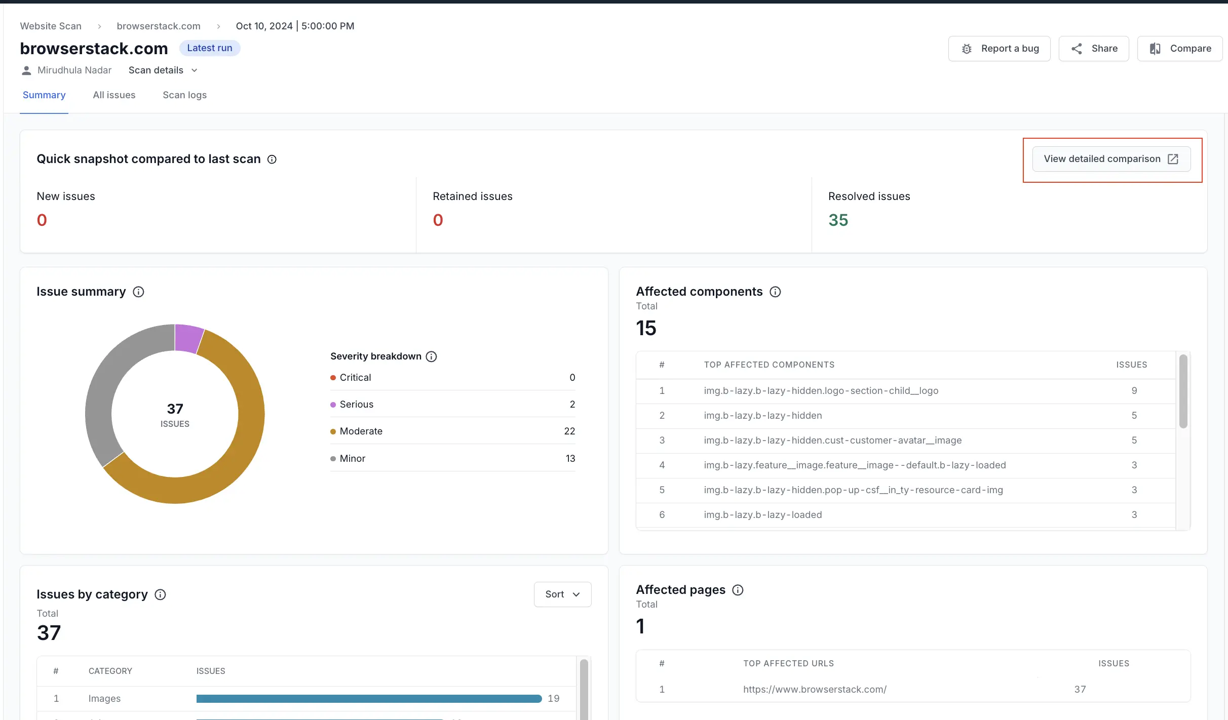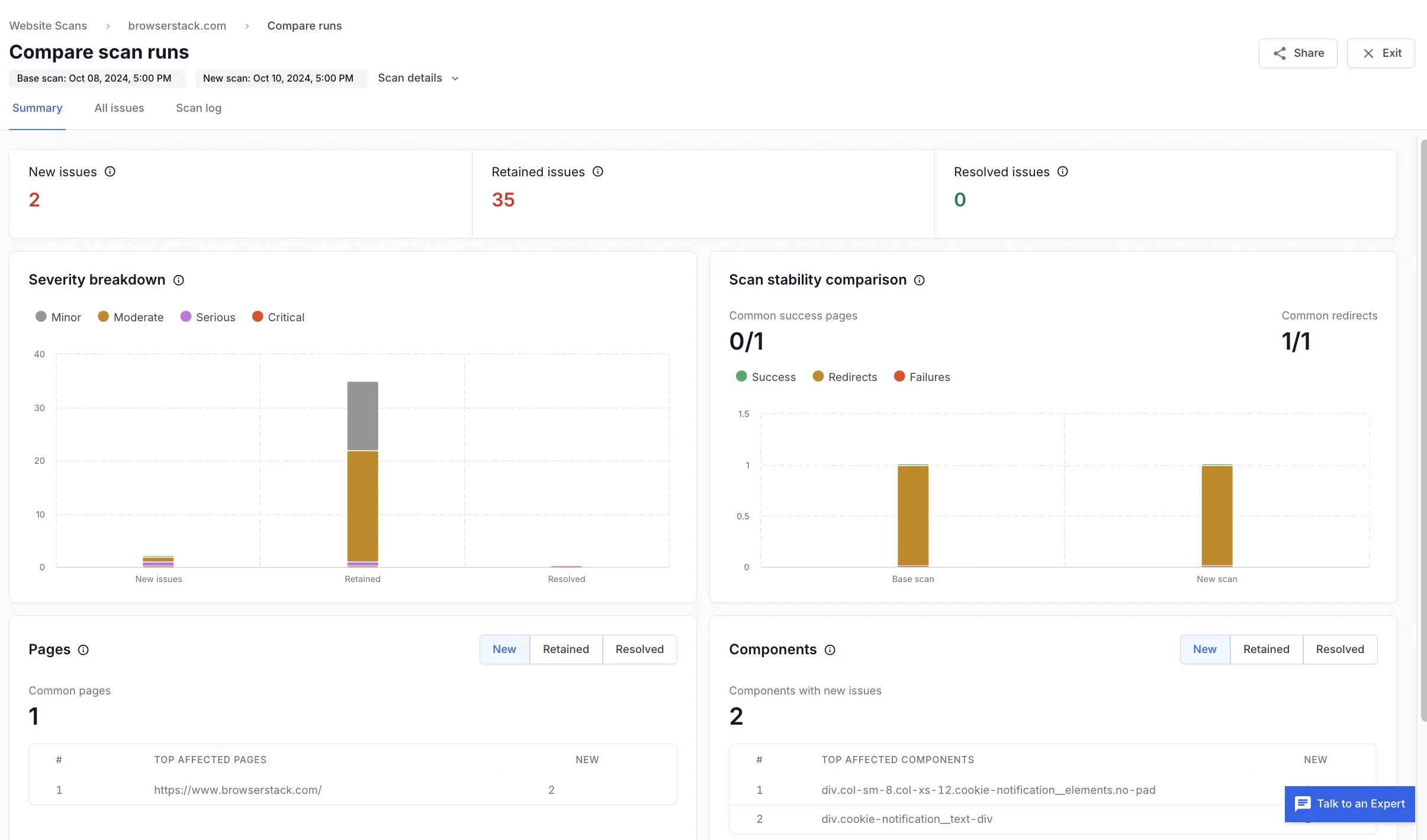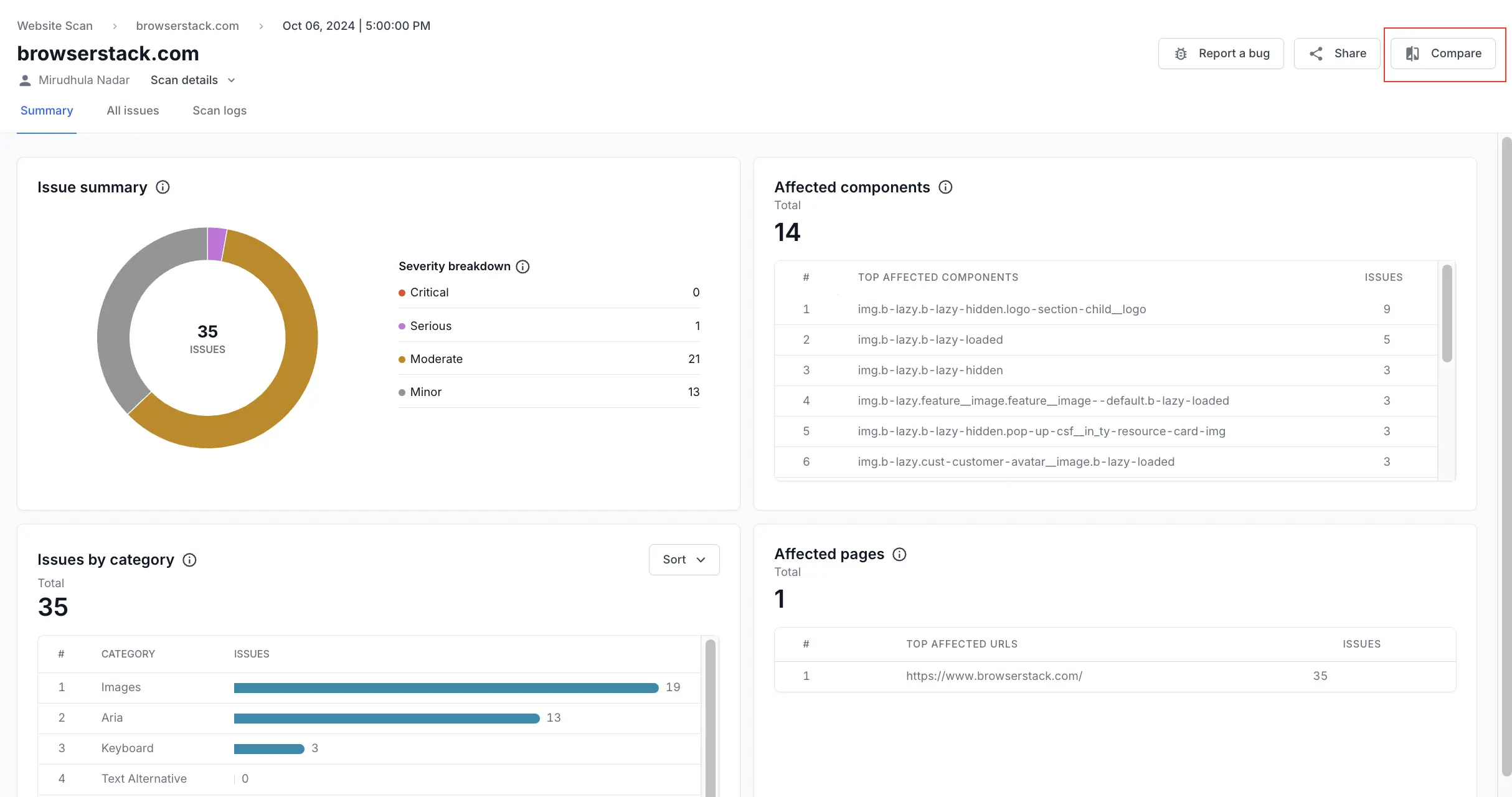 The reports comparison feature allows you to compare two scan runs or two Automated Tests reports of a website. You can compare multiple scan runs belonging to the same build (not two reports from multiple builds) using reports comparison. Using this feature, you can effectively track the progress of accessibility compliance on your website.
