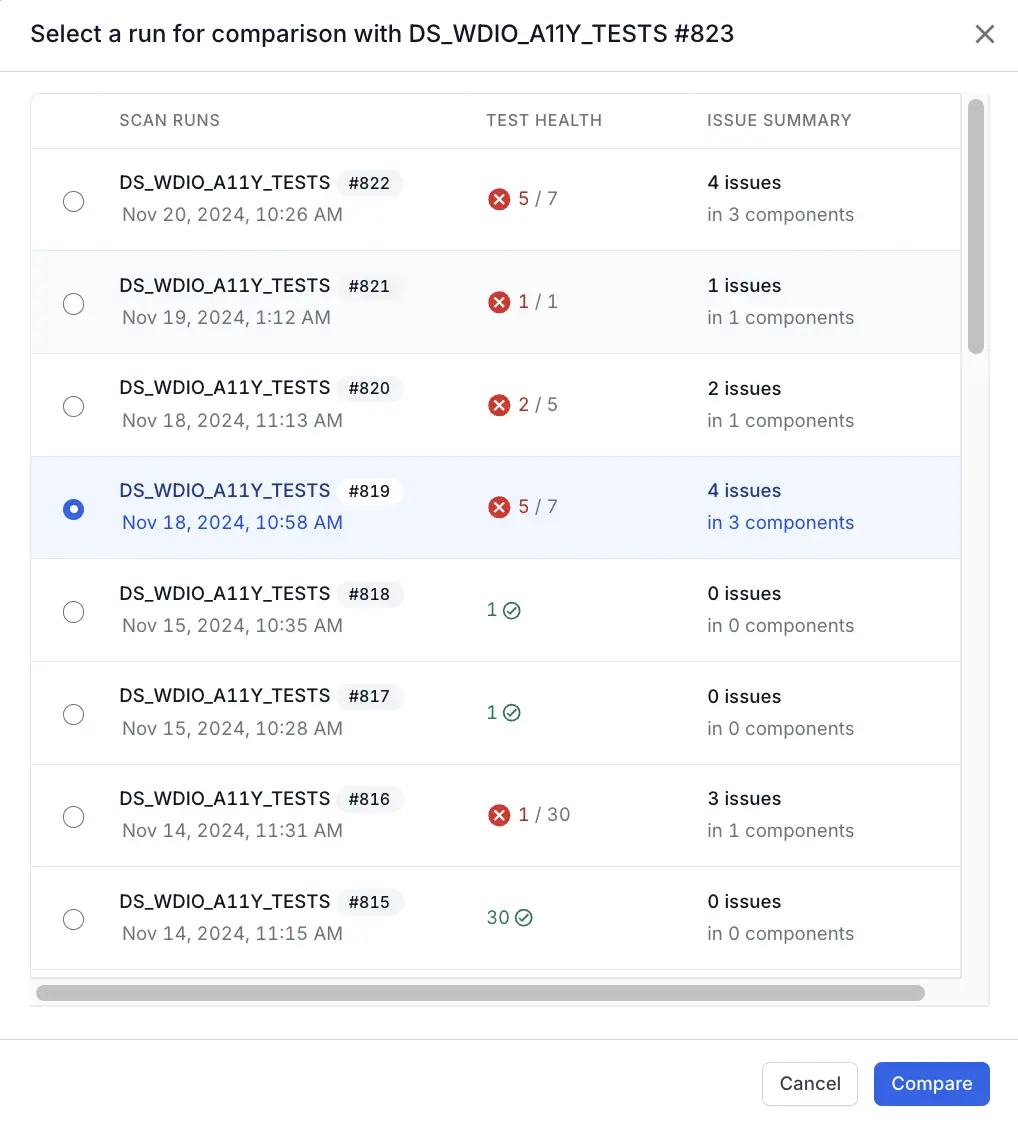 - On the Scan runs tab, select the checkboxes against any two scan runs you want to compare.