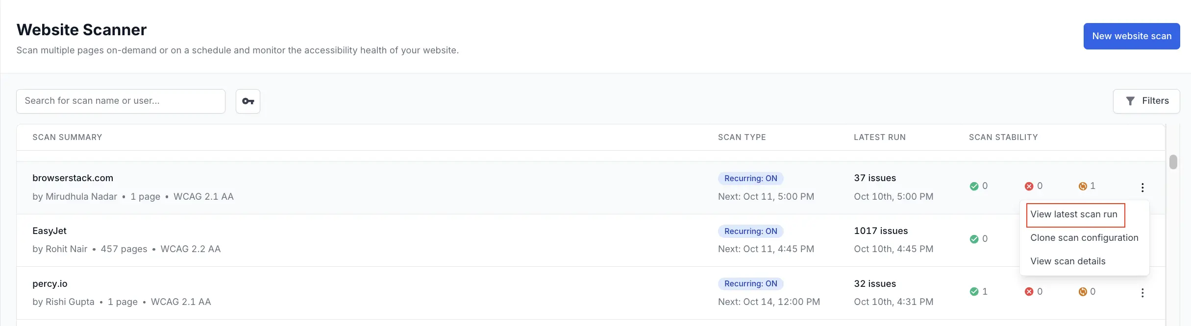- On the Website Scanner page, click the three-dots icon next to a scan.