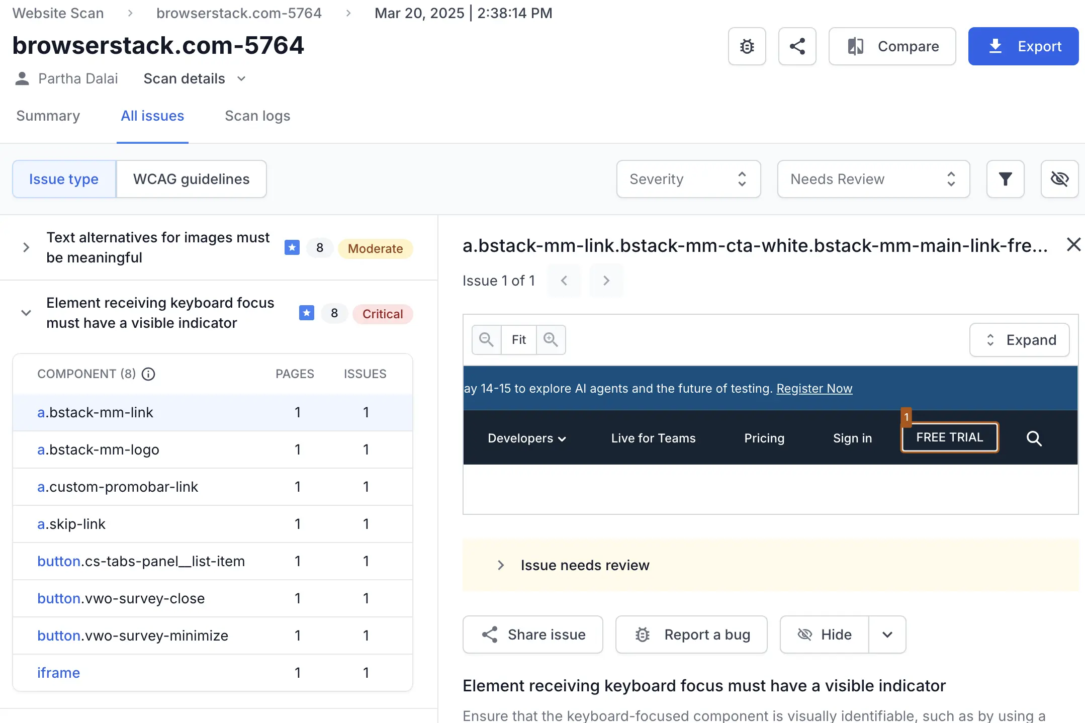 You can also save these preferences for future use. If you do, BrowserStack Accessibility Testing will automatically hide or unhide issues in the same component or related to the same rule in the future. It will also determine whether similar issues under Needs Review should be marked as issues or not.