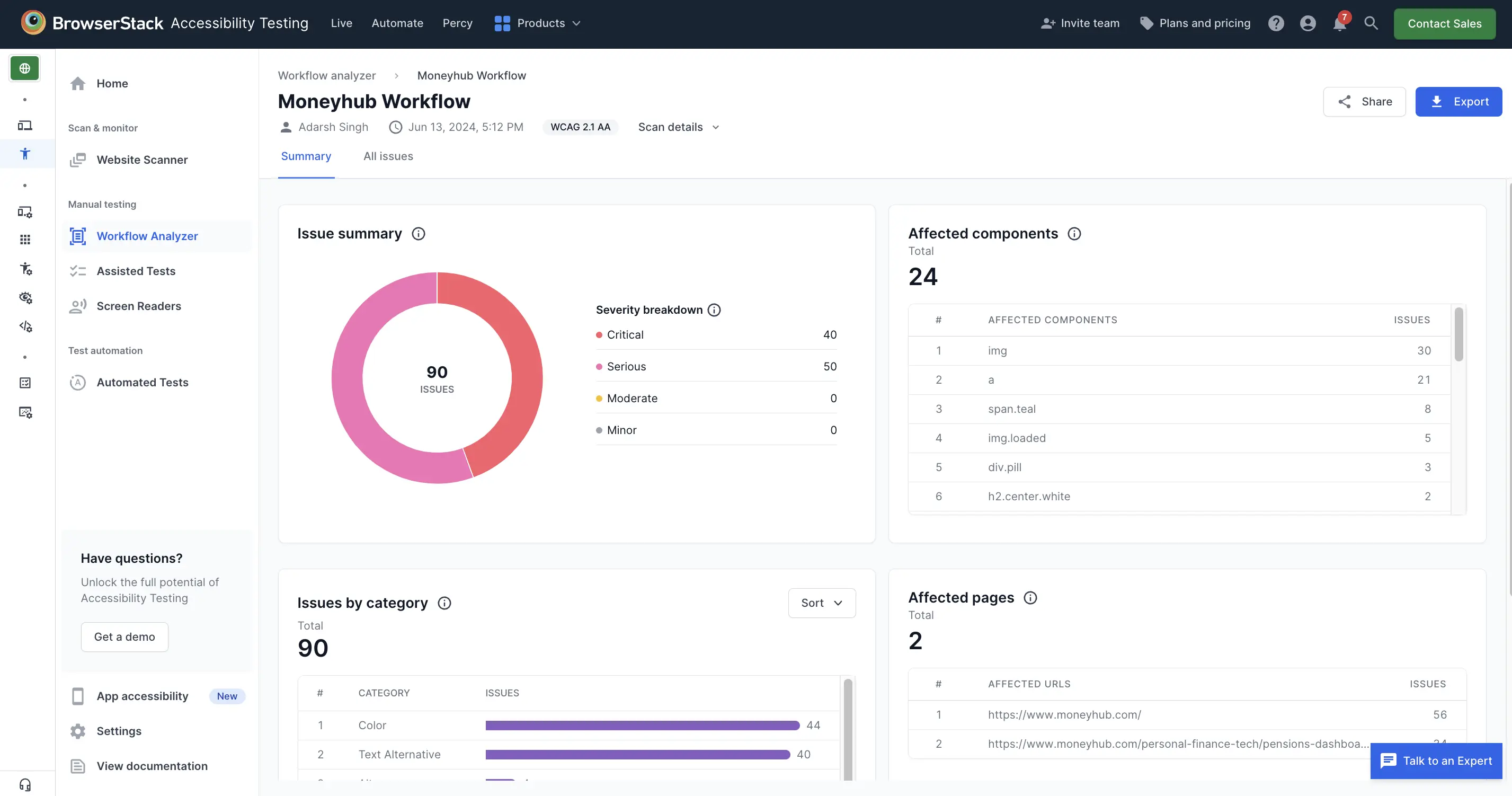 Summary: It shows a visual summary of the accessibility test. You can view the issues identified broken down based on their severity, the affected components and pages, issue category, conformance summary, issues that need review, and issues that are hidden.