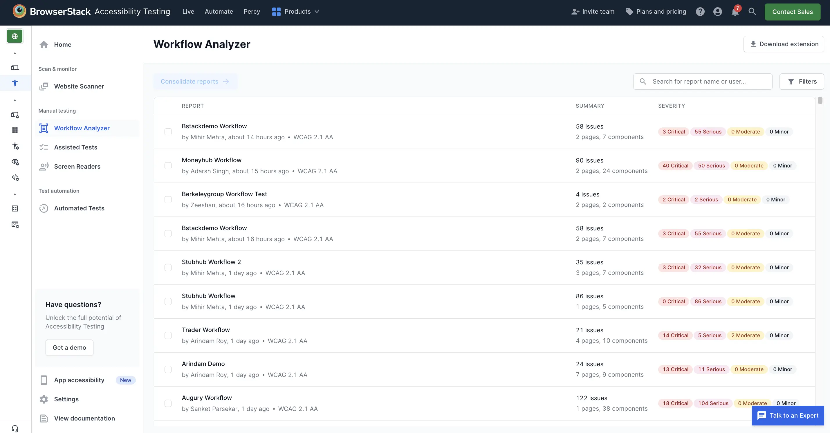The Workflow Analyzer page lists all the accessibility test reports run using the Workflow analyzer.