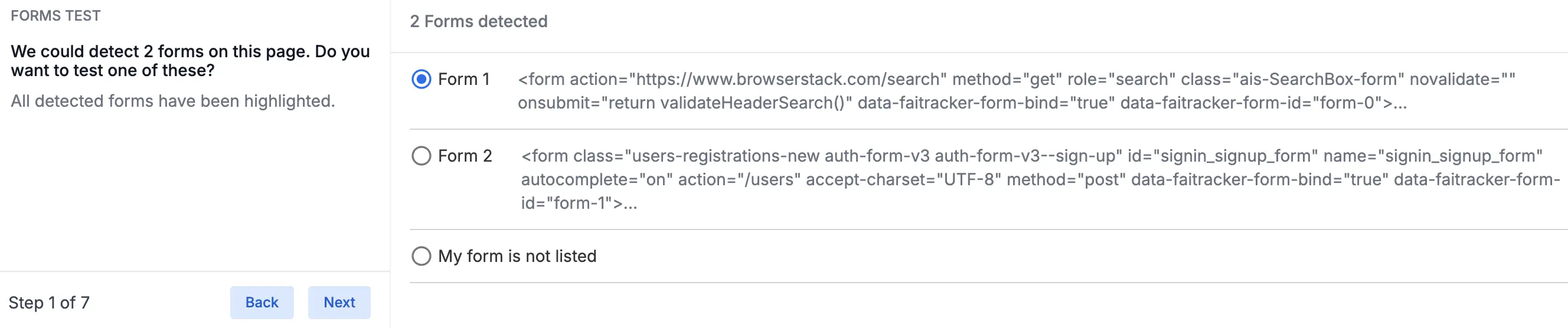 - The extension automatically detects any forms available on the webpage. Select the form you want to test. In case your form is not detected, you can choose the option My form is not listed and select your form manually.