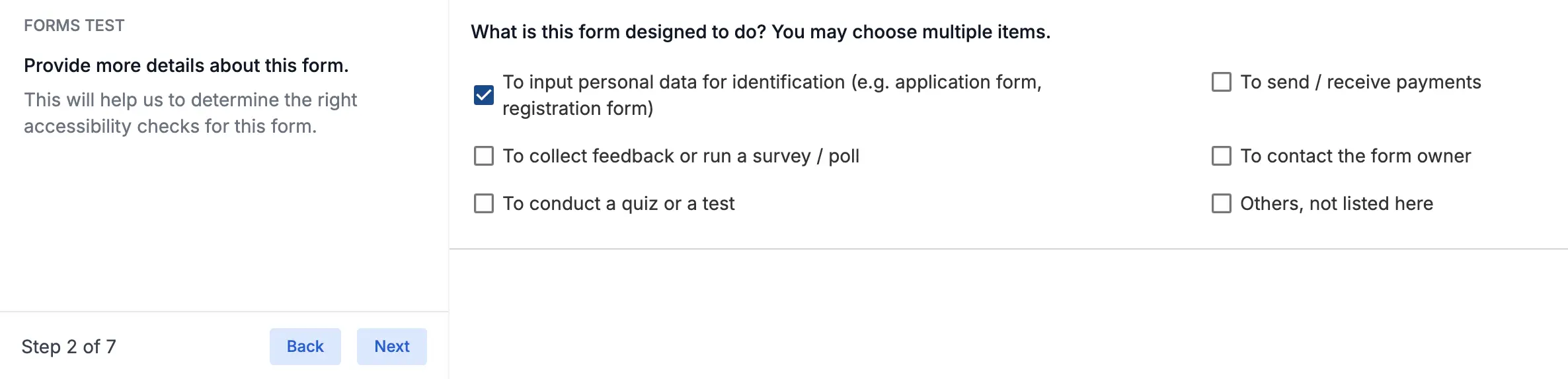 - Click Next. Select the type of form from the listed options. You can select more than one option, in case the form serves multiple purposes.