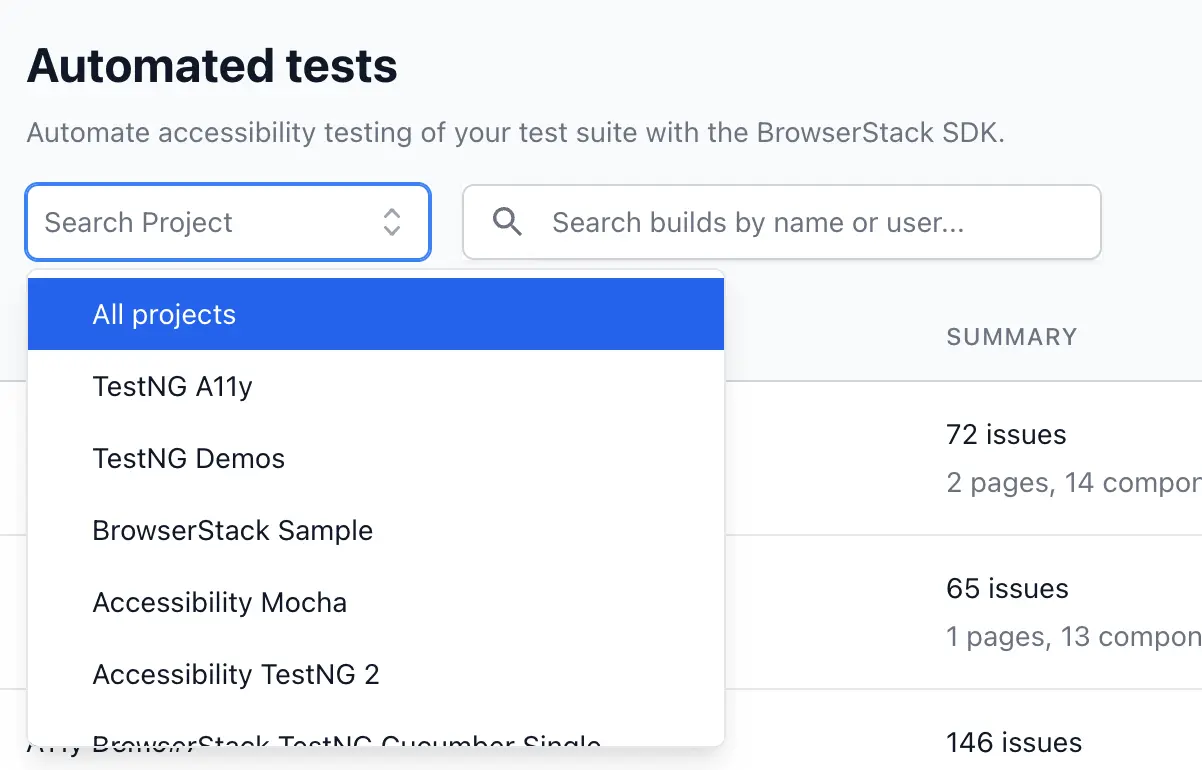 projectNamekey in thebrowserstack.ymlconfig file of the SDK. - It is recommended to create unique projects for each of your pipelines or applications under test.