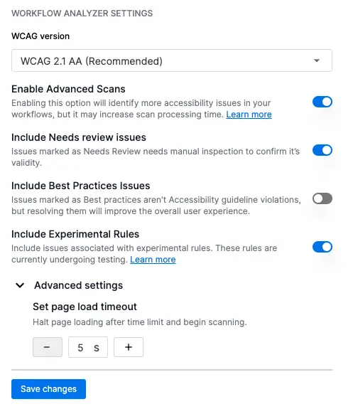 To disable the use of Experimental rules for your organization, contact support. - Optionally, set a page load timeout in Advanced settings.