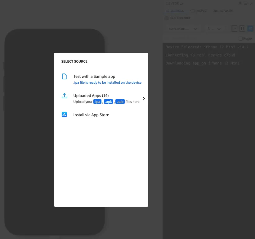 - Select a test on the right navigation and choose the desired testing device and OS combination.
