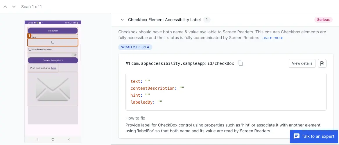 The following example scan report highlights that the checkbox element lacks an associated label, making it inaccessible to users relying on screen readers.