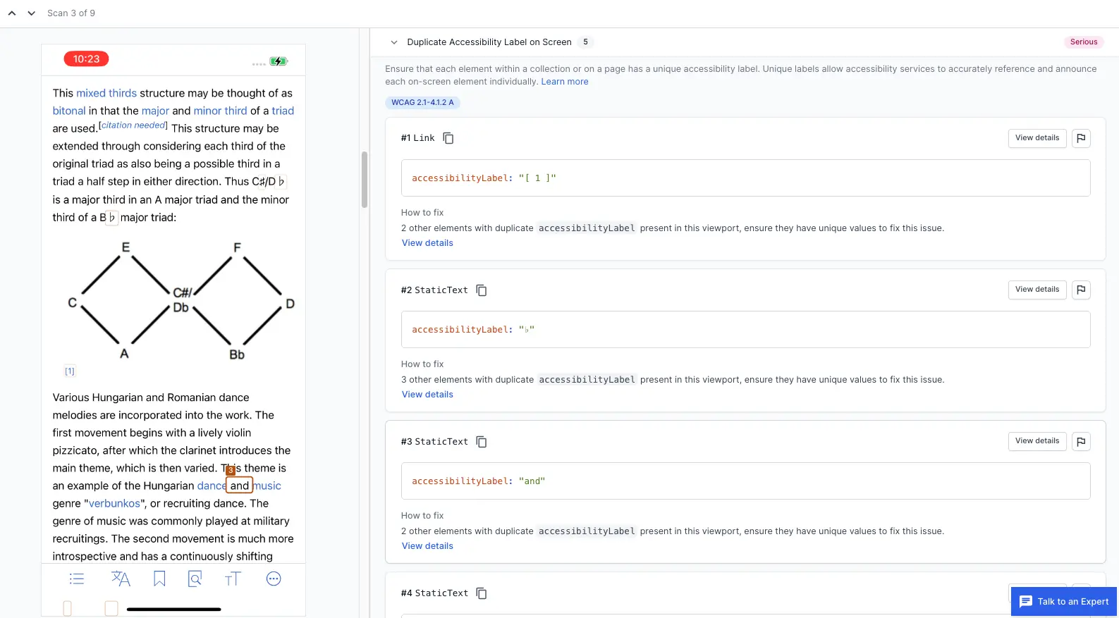The following example scan report shows duplicate accessibility label violation in the app’s interface. Several elements have duplicate accessibility labels, creating confusion for users who rely on screen readers.