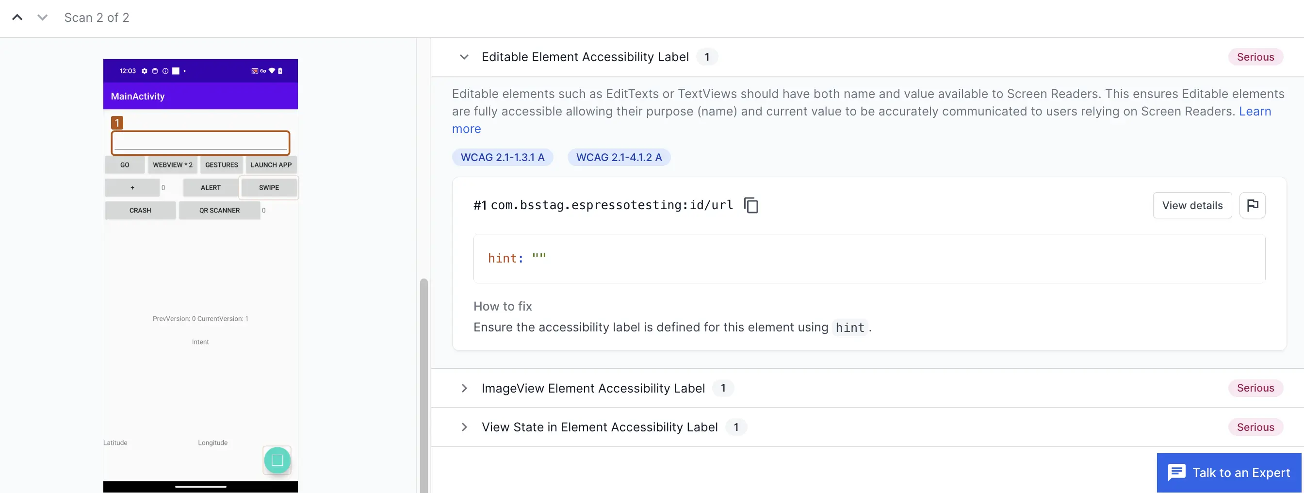 The following Android example scan report highlights the editable element with the ID com.bsstag.espressotesting:id/url lacks an accessibility label. This violation prevents screen readers from providing the necessary information to users.