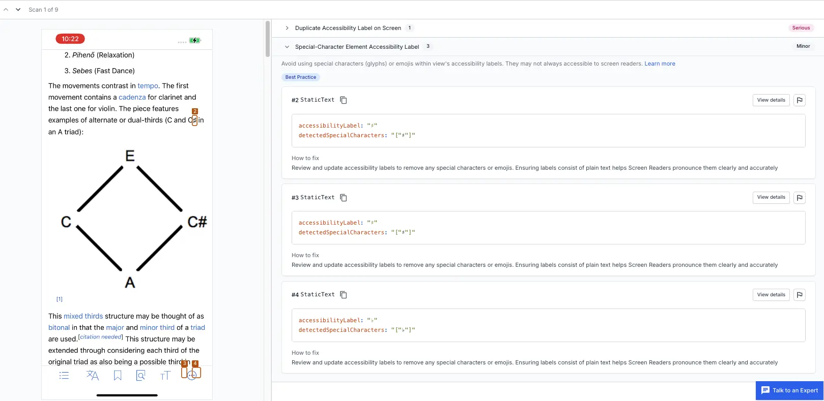 In the following example report, various elements have accessibility labels that include special characters (e.g., “♯”, “♭”) are identified.