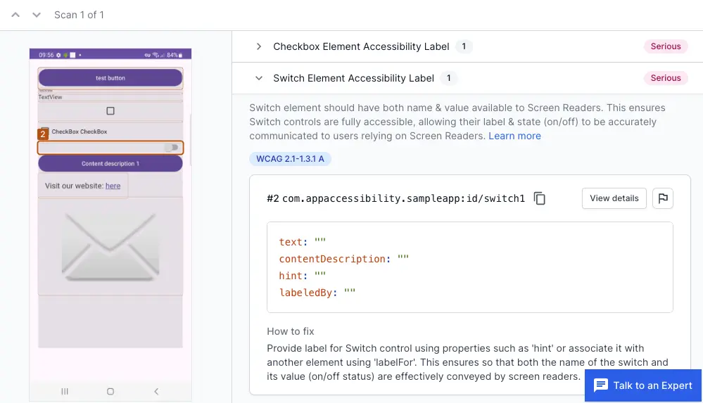 App accessibility can automatically check for violations related to switch element labels. It analyzes the app’s interface to ensure that each switch control has a proper name and value that can be read by screen readers, highlighting any areas that need improvement.