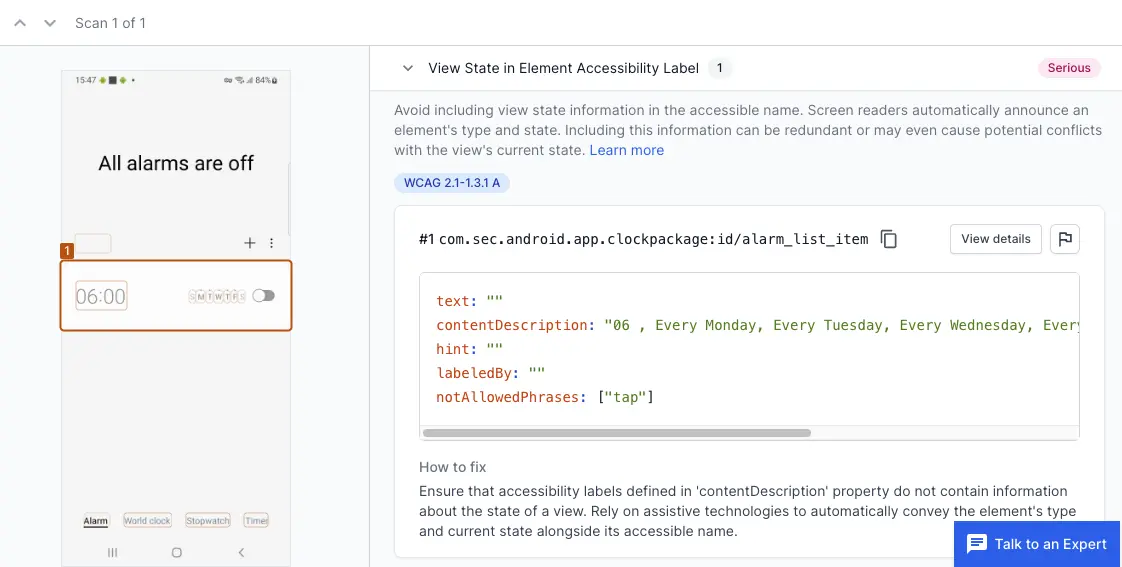 In the following example scan report, the alarm element’s accessibility label includes view state information. The alarm set for 06:00 AM includes the state information "tap" in its content description. When a screen reader announces this element, it reads the entire label, including the "tap" state. This is redundant because the screen reader will automatically announce the state of the element.