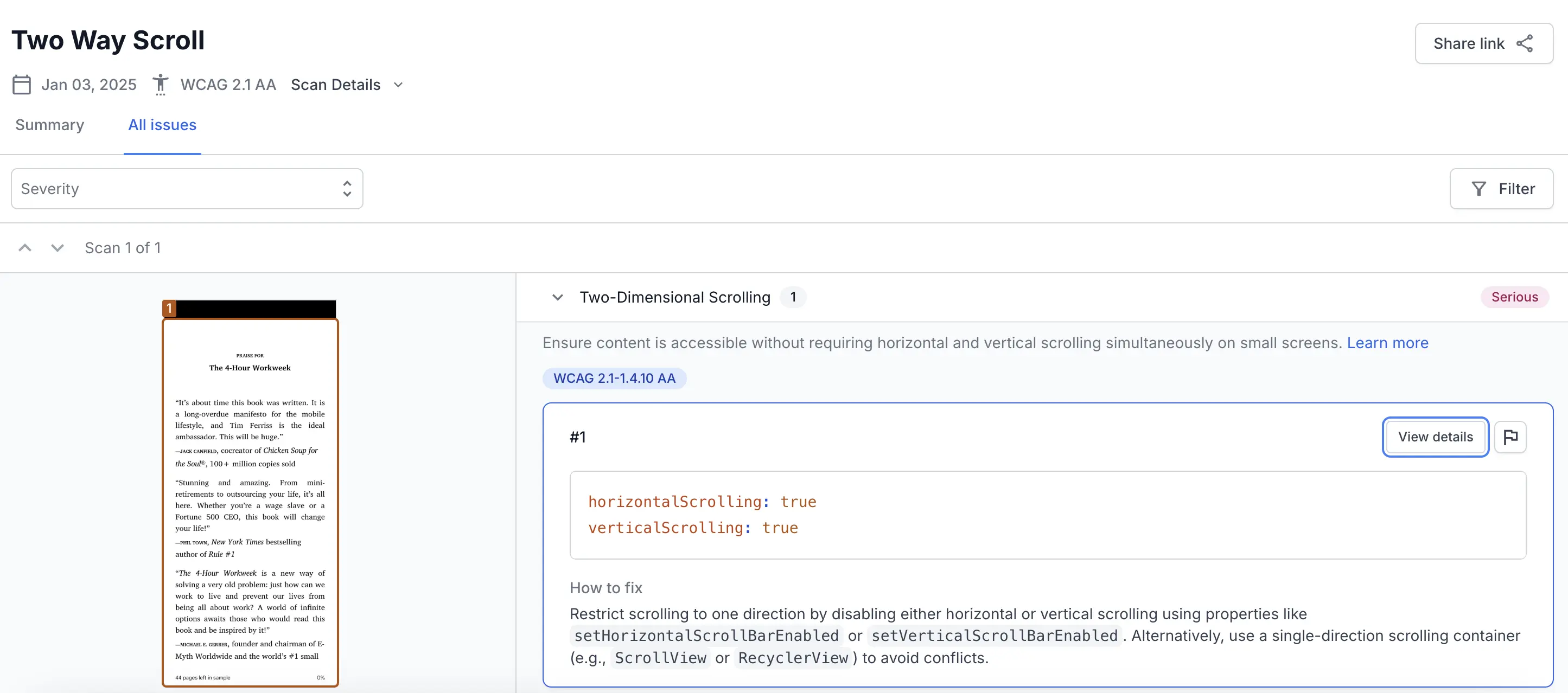If the page generally requires horizontal scrolling, ensure vertical scrolling is not required to read the content by setting thesetHorizontalScrollBarEnabledproperty. Use thecanScrollVerticallymethod for validation. -
