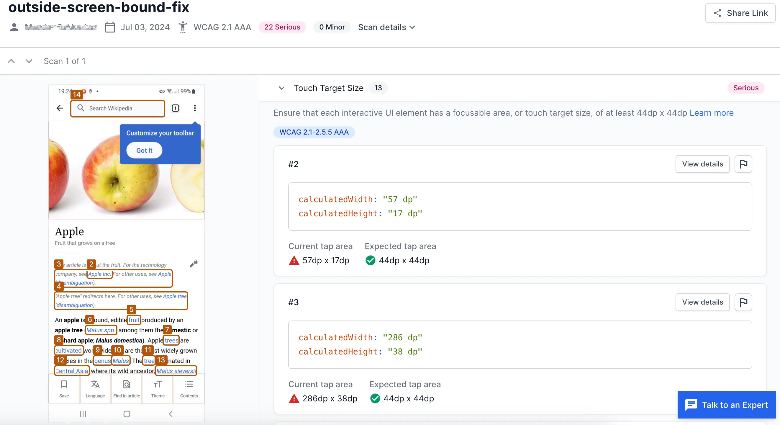 The Touch target size rule checks whether interactive UI elements meet a minimum size requirement to ensure they are easily operable by all users, especially those with motor impairments or those using assistive devices. Adhering to this minimum target size requirement promotes greater usability for everyone.