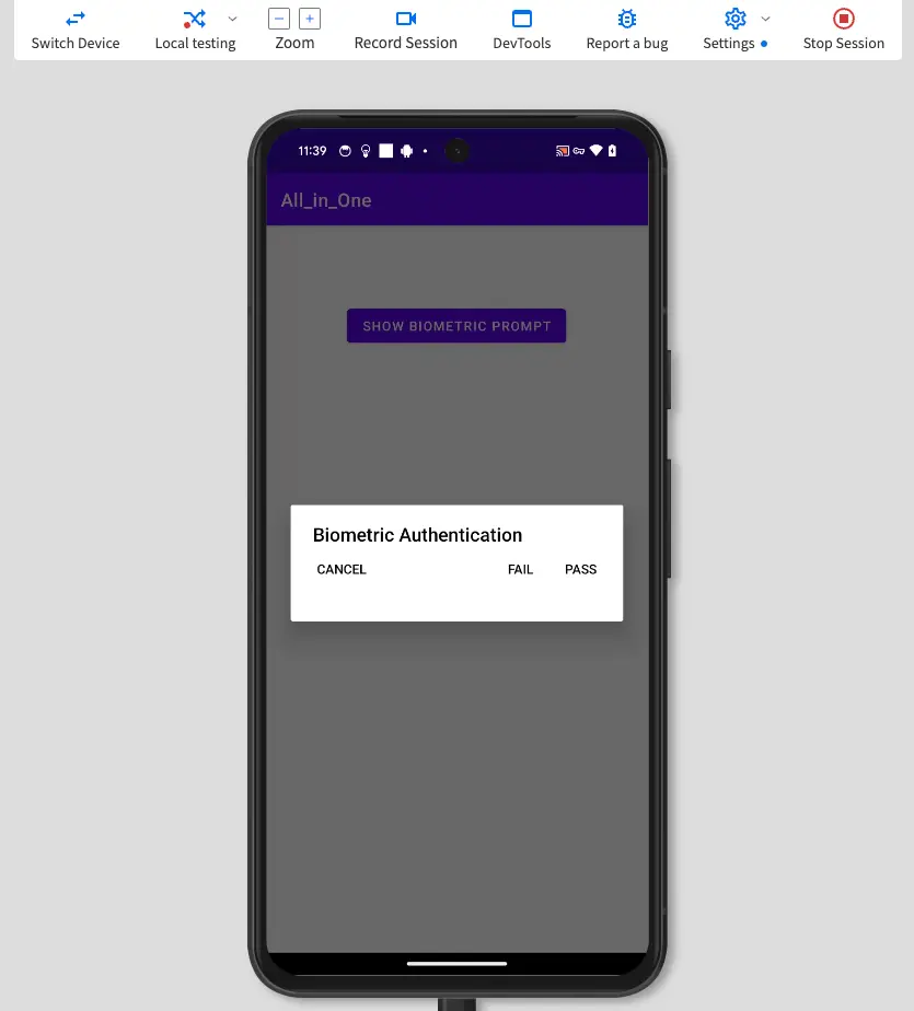 You can use the custom executor to select Pass, Fail, or Cancel on your device and test various authentication success or failure scenarios. BrowserStack App Automate attempts to closely mimic the biometric authentication behaviour on real devices. Based on your platform, refer to this table to understand device behaviour: