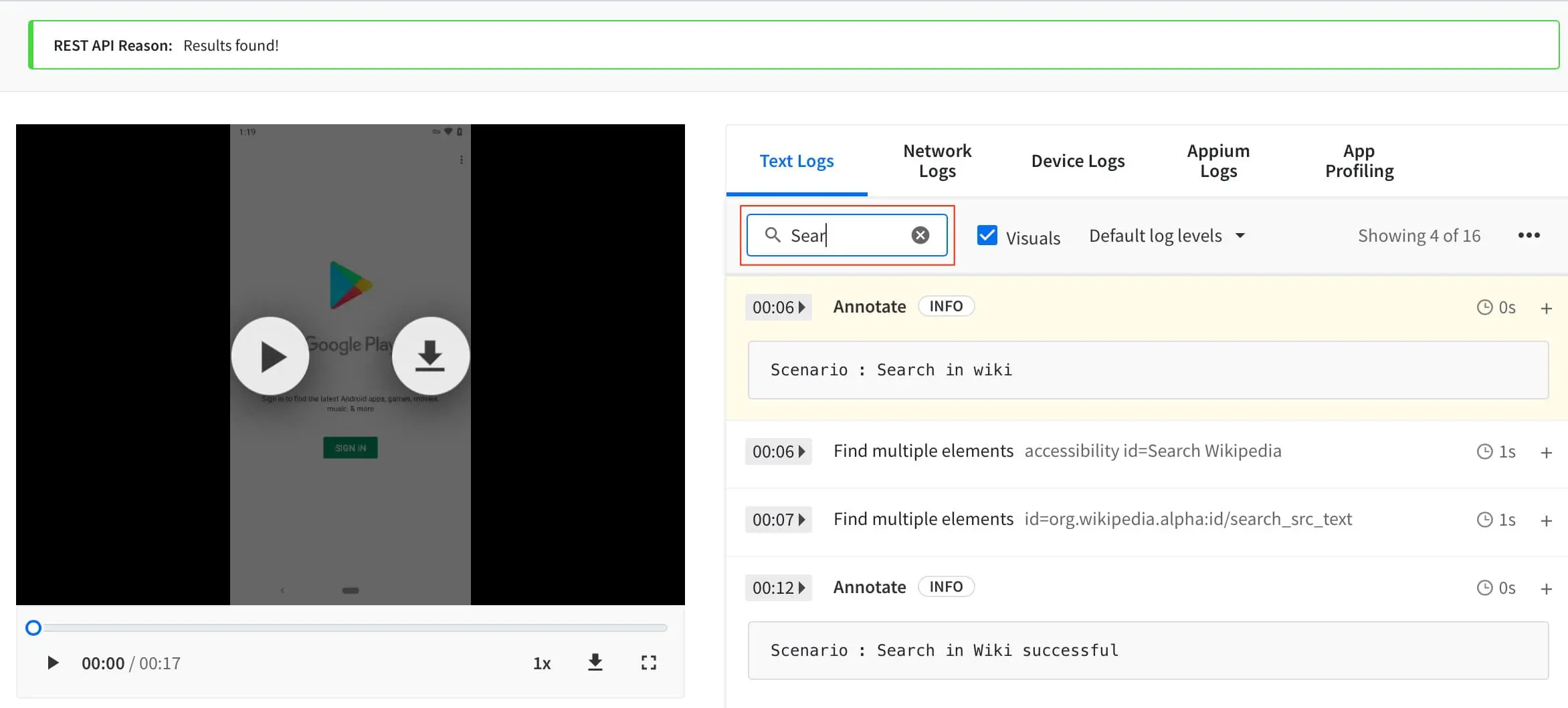 You can either search with the logged text in the searchbar or directly navigate to the section of test execution where you want to troubleshoot. This search feature is particularly helpful when your test sessions run for a long duration.