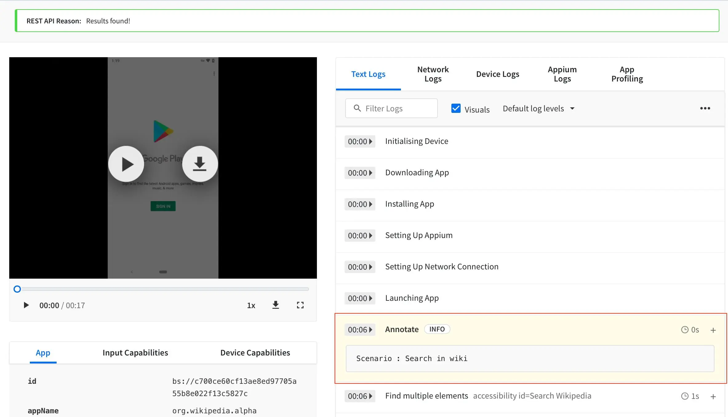 After your test script has sent console annotations to BrowserStack, you can find all the annotations pushed to the logs in the Text Logs tab on the App Automate dashboard.