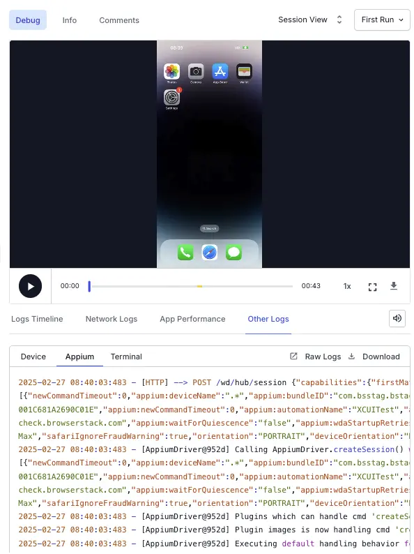 Appium logs are generated by the Appium server and contain a detailed record of your Appium test session execution. They can help you troubleshoot any errors if your test session fails. Appium logs are enable by default.