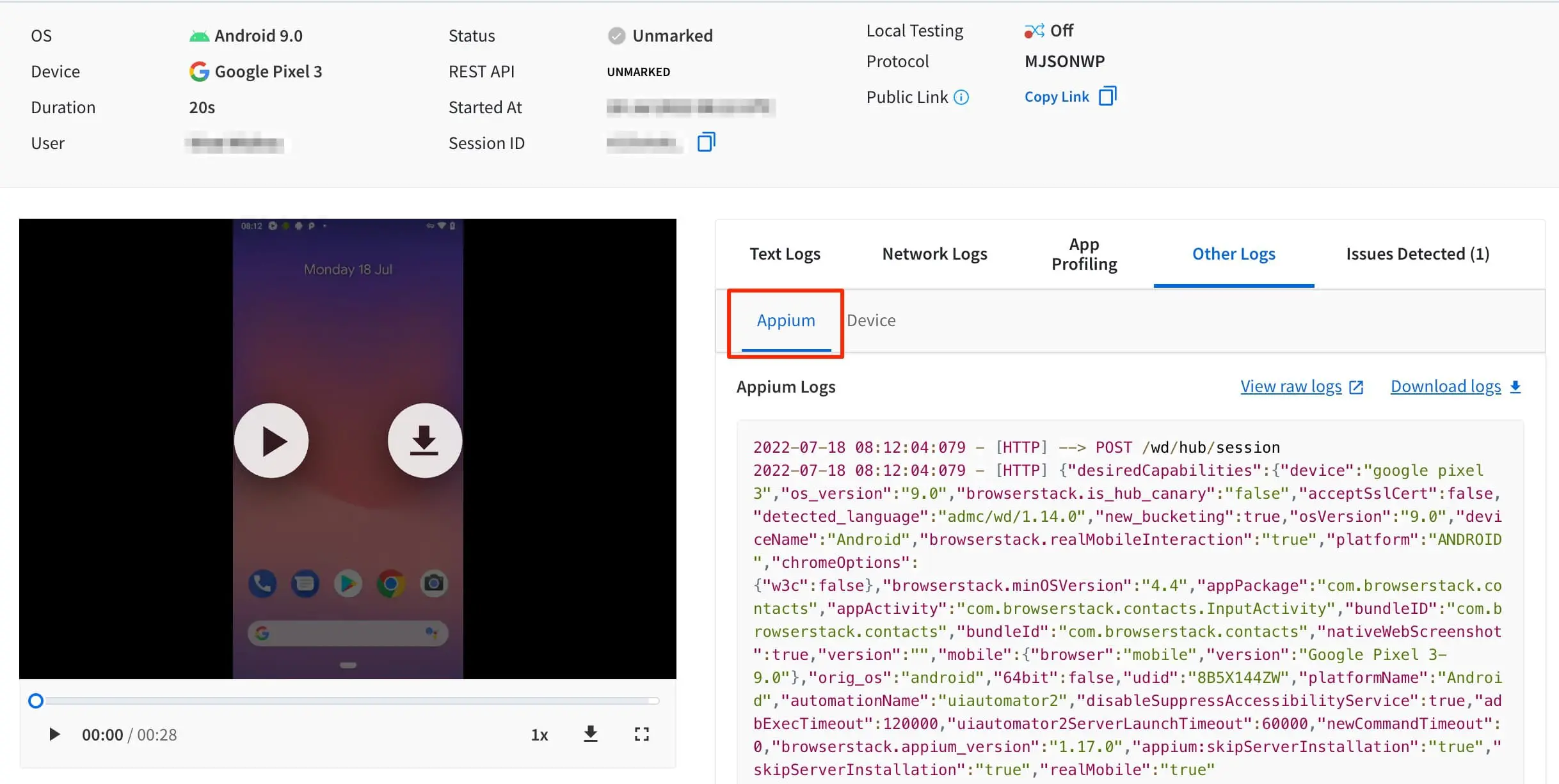 Capture raw Appium logs for your test. |