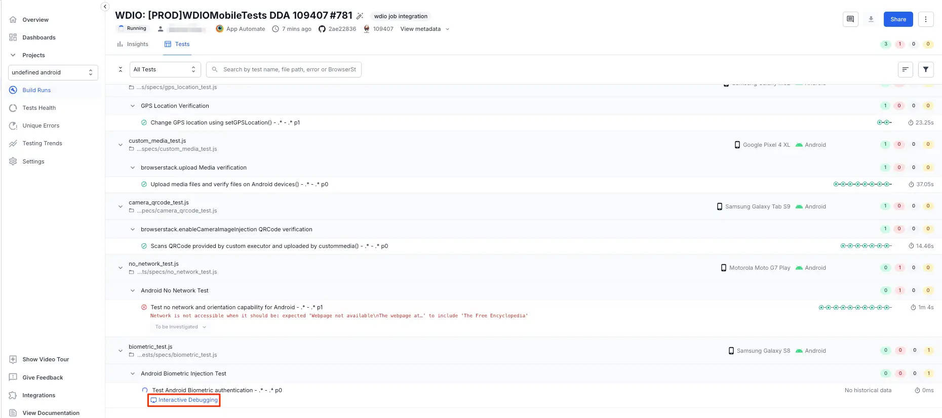 An interactive session lets you view, interact, and debug any ongoing test session on the App Automate platform.