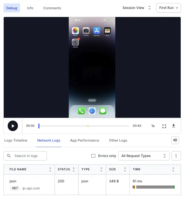 Network Logs capture performance data such as network traffic, latency, HTTP requests and responses in the HAR (HTTP Archive) format. You can leverage network logs to get a clear picture of all the network requests (e.g. REST API calls) originating from your app, and the time taken for each of these requests. It can help you identify performance bottlenecks or debug failed REST API responses. You can visualize HAR files using the HAR Viewer.
