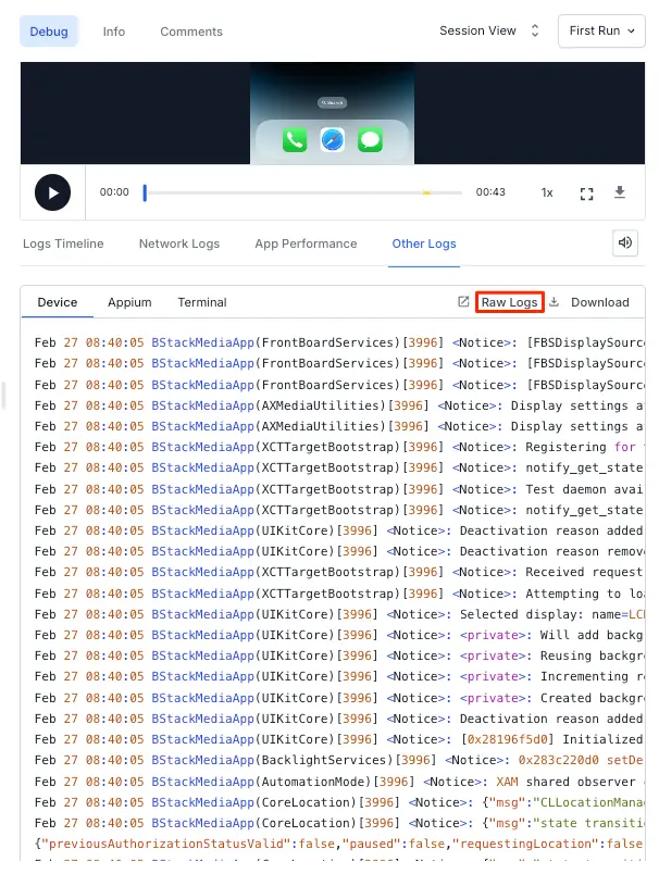 The network logs can be viewed from the test sessions details page on the App Automate Dashboard. You can view or download network logs using the Raw Logs**.